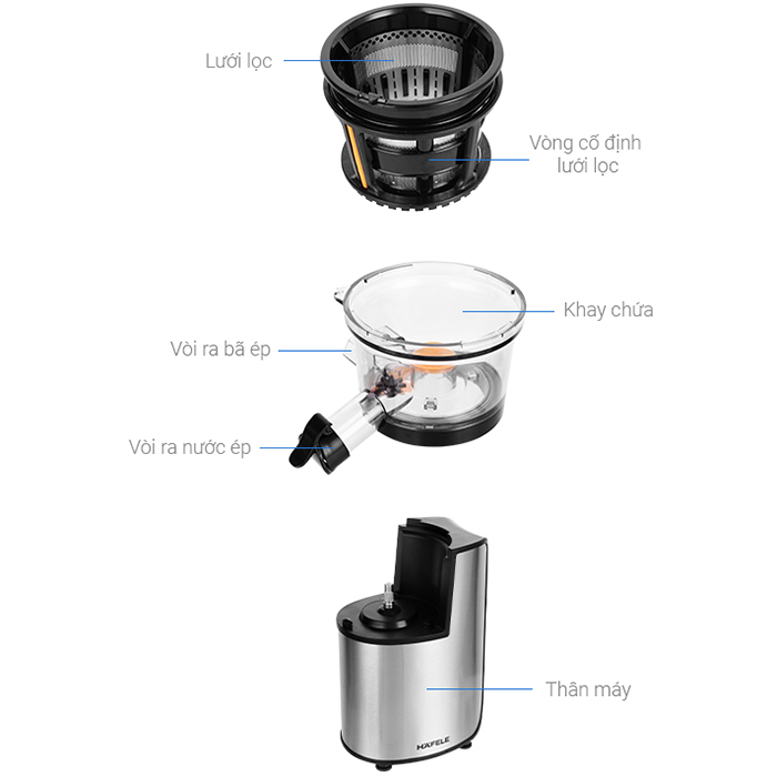 Khay chứa nước ép bằng chất liệu nhựa không chứa BPA, đảm bảo an toàn cho sức khỏe, không tiết chất độc hại vào nước ép khi dùng, dễ chùi rửa. Lưới lọc bằng thép không gỉ bền, hạn chế rỉ sét, lọc sạch cặn cho nước ép, tiện loại bỏ vết bẩn với bàn chải đi kèm.