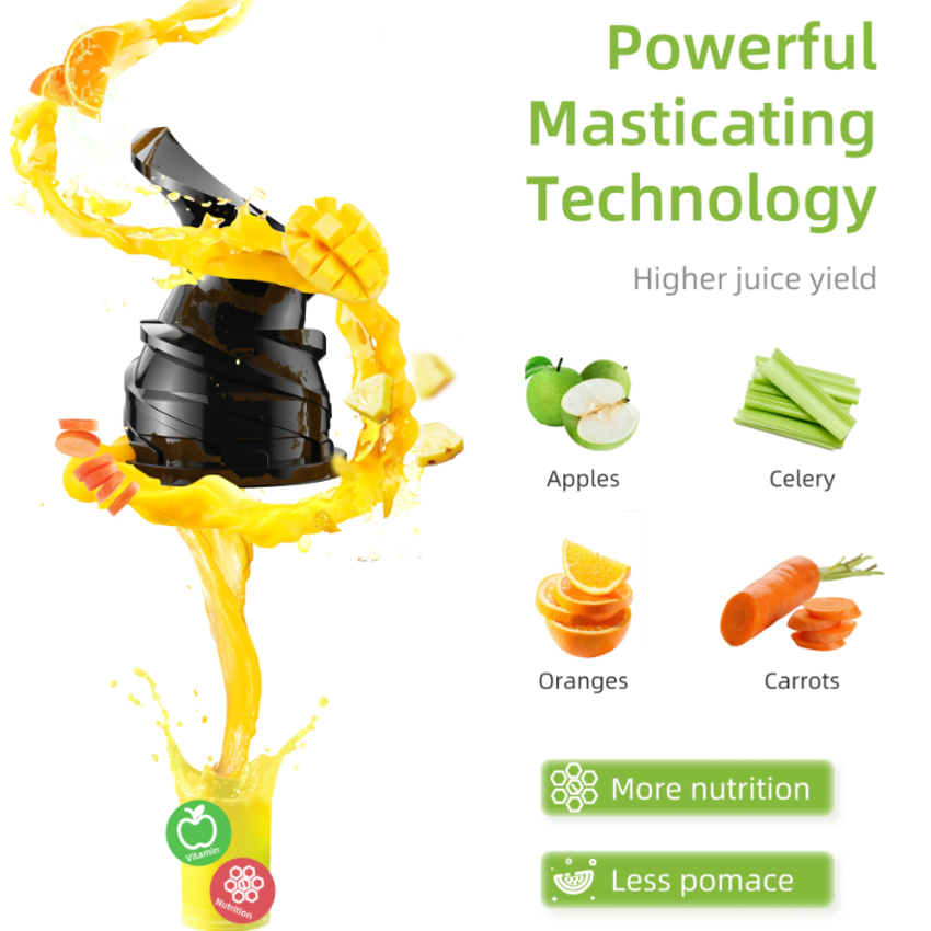 Ép kiệt hơn, giàu Vitamin và nhiều hương vị hơn! Đường kính khoang ép lớn lên đến 130mm, giúp ép nguyên quả dễ dàng mà không cần cắt nhỏ. Tốc độ quay chậm chỉ 40