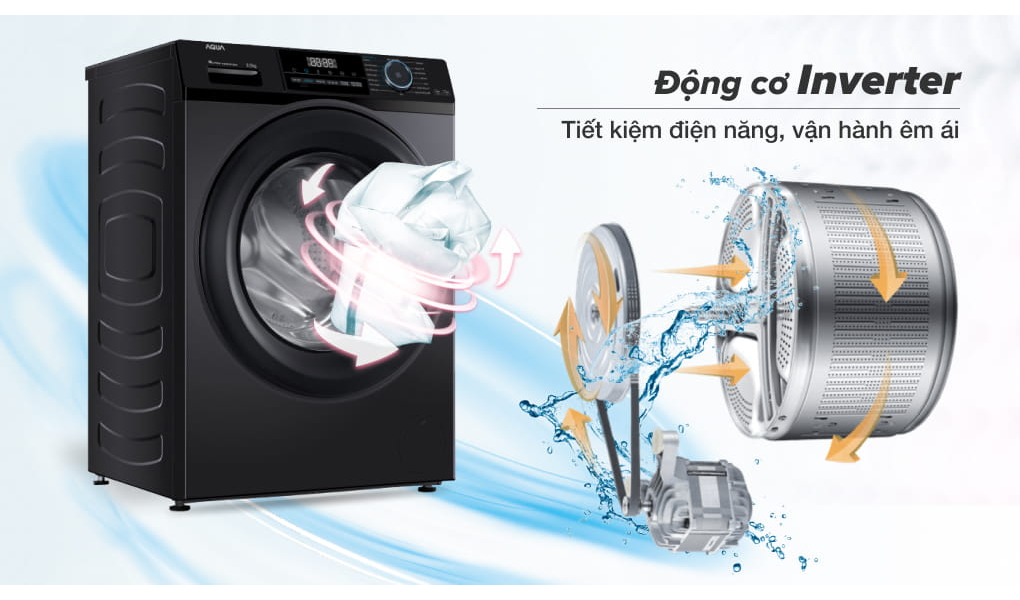 - Công nghệ cân bằng AI DBT giúp máy vận hành ổn định, hạn chế tiếng ồn và tăng tuổi thọ sản phẩm. Hình ảnh chỉ mang tính chất minh họa sản phẩm - tự làm sạch mặt trong cửa và vòng đệm cửa, các tia nước sẽ tự động rửa sạch xơ vải còn sót lại trong lồng giặt, ngoài ra công nghệ này còn làm sạch xà phòng, chất bẩn bám trên thành cửa máy, giúp quần áo lấy ra được sạch sẽ hơn. Hình ảnh chỉ mang tính chất minh họa sản phẩm - giúp làm sạch quần áo dễ dàng hơn với thiết kế lồng giặt có nhiều lỗ thoát nước nhỏ chỉ 2.5 mm, bảo vệ quần áo tránh các xơ vải mắc vào lỗ thoát nước. *Hình ảnh chỉ mang tính chất minh họa sản phẩm Động cơ - công nghệ tiết kiệm điện