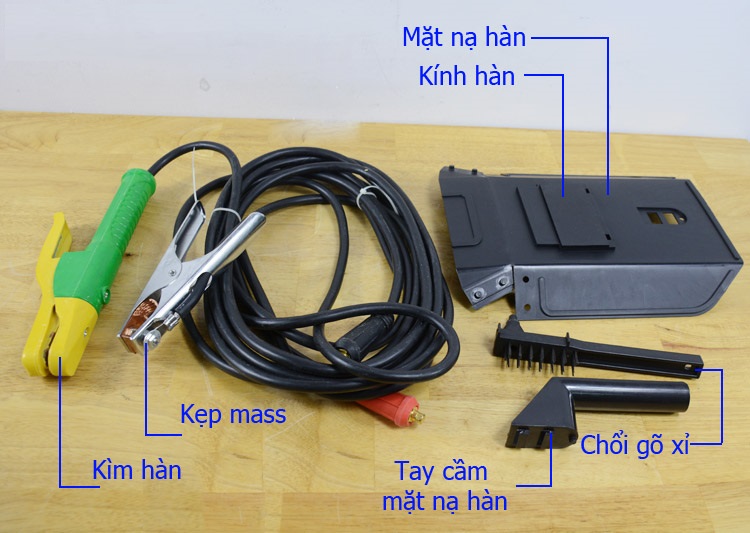 Phụ kiện máy hàn gồm: Kìm hàn có dây dài 5m, Kẹp mass có dây dài 3m, mặt nạ hàn, kính hàn, búa gõ xỉ, tay cầm của mặt nạ hàn. Máy có thể hàn 4 chấm điểm, 3.2mm liên tục được.
