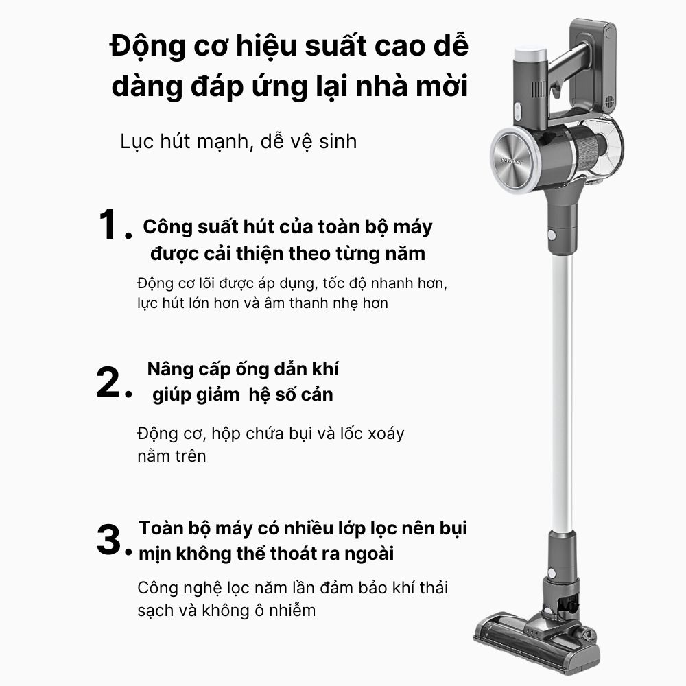 - Thế hệ động cơ mới mạnh mẽ với lực hút mạnh lên đến 20000Pa giúp bạn dễ dàng hút sạch mọi loại bụi bẩn kể cả bụi mịn.