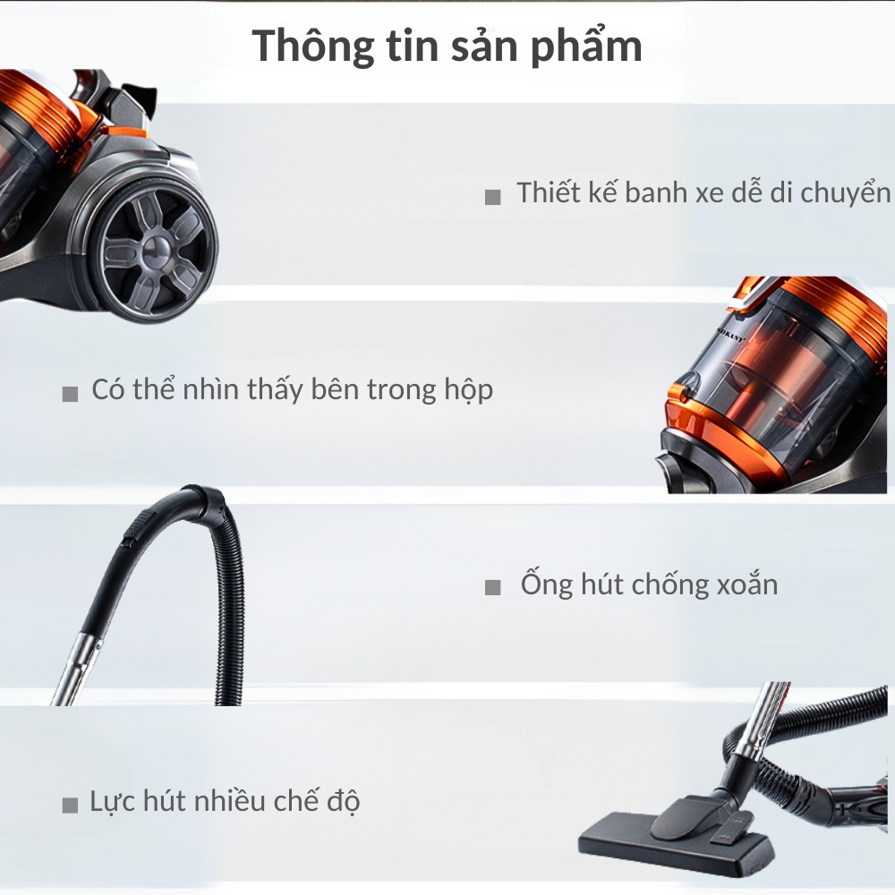 Công nghệ hút bụi lốc xoáy hiện đại không túi chứa bụi Đặc biệt thiết thực nhờ thiết kế nhỏ gọn Dễ dàng đổ sạch hộp chứa bụi chỉ bằng một nút nhấn Xử lý
