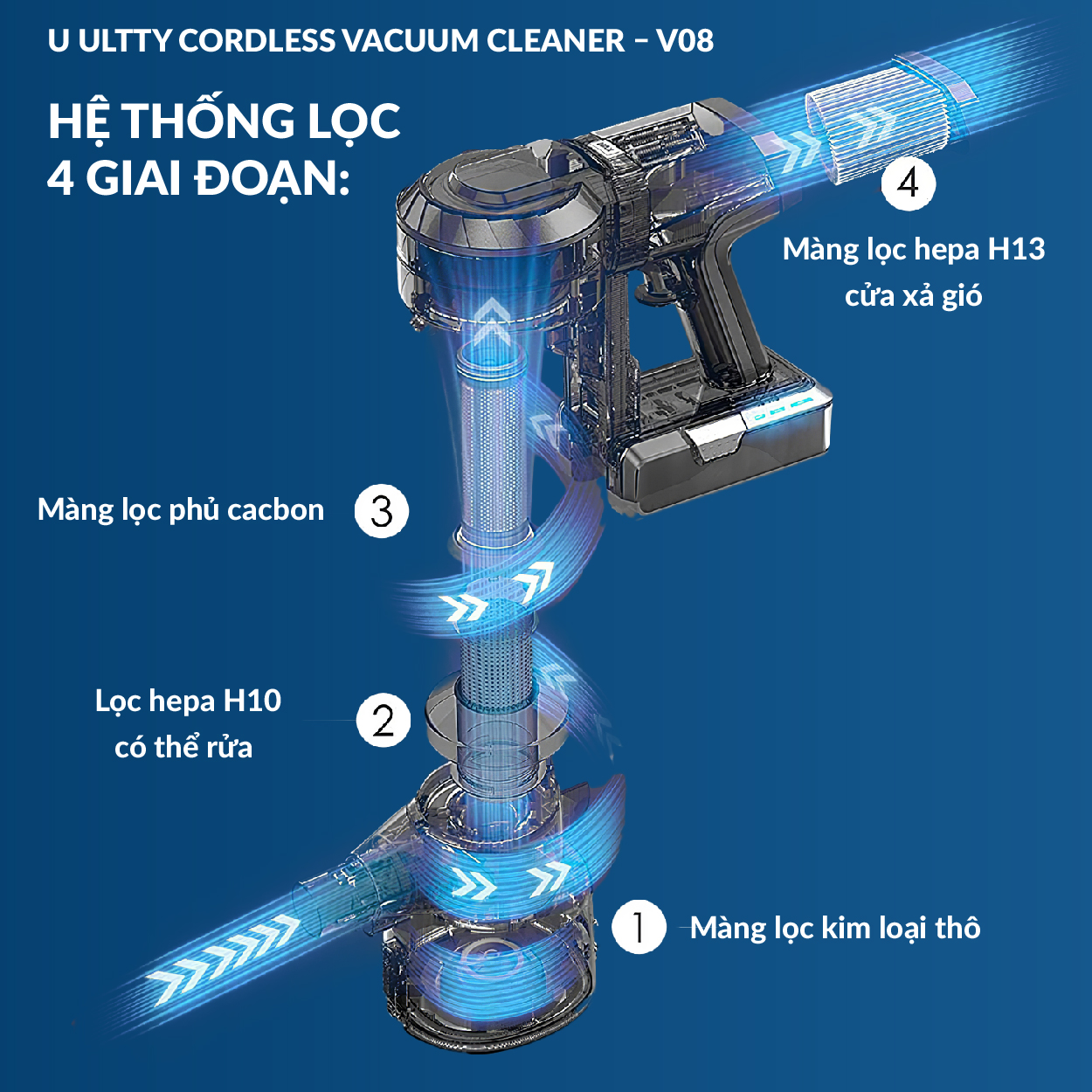 Các tính năng vượt trội của máy hút bụt và lau nhà ULLTY V08 Lực hút công suất mạnh mẽ, thiết kế nhỏ gọn tiện dụng