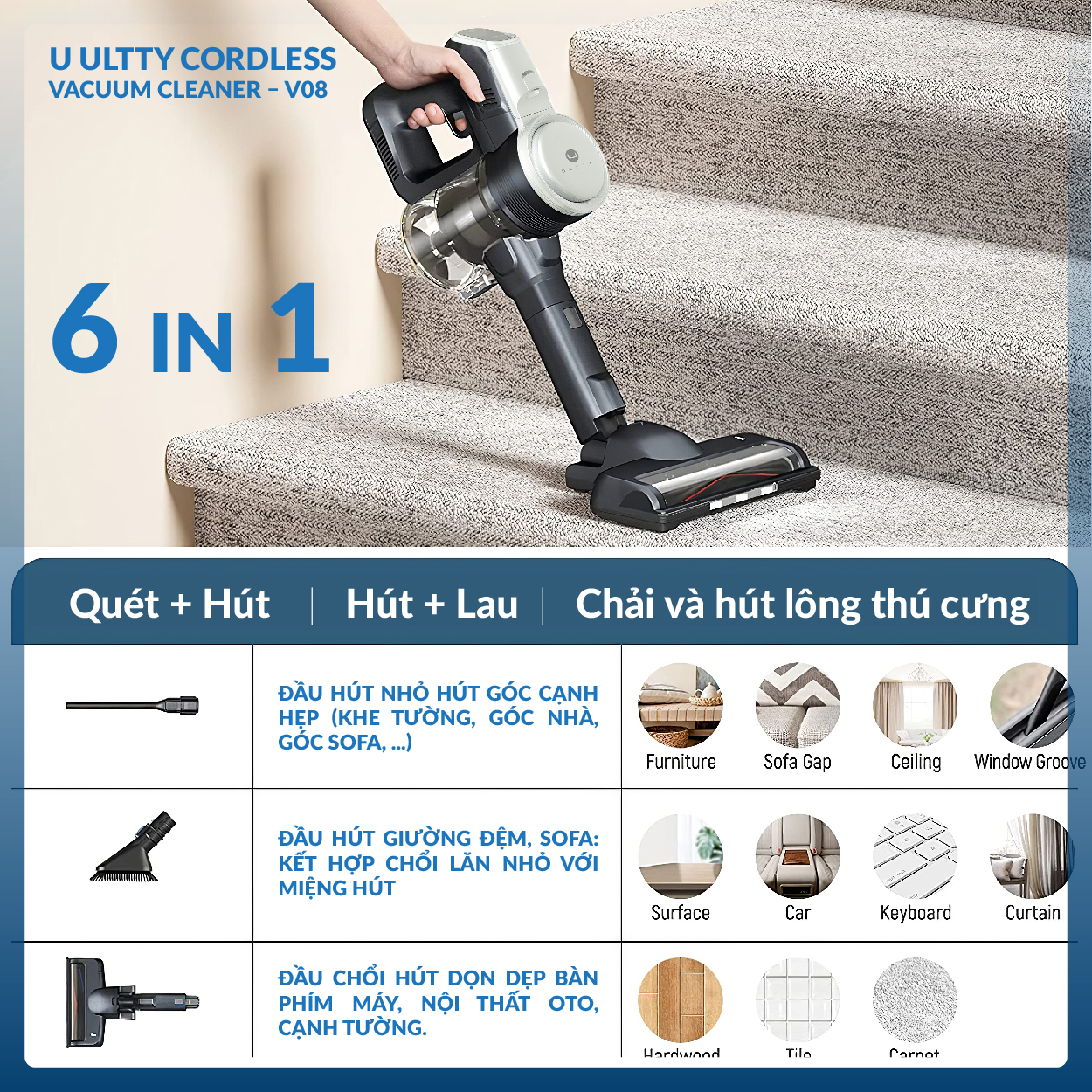 - Chổi quét sàn đa chức năng. sử dụng 3 loại chất liệu bàn chải khác nhau với tuổi thọ cao giúp đảm bảo hoạt động tốt ngay cả trên sàn, thảm trong thời gian dài Máy hút bụi lau nhà cầm tay Ultty V08 là máy hút bụi đa năng , có thể kết hợp sáu công dụng trong một máy gồm : Máy hút bụi lau nhà được thiết kế với sáu công dụng trong một máy đáp ứng được mọi bề mặt mọi ngóc ngách trong căn nhà ,giúp bạn có thể tiết kiệm chi phí với nhiều công dụng trong 1 Bộ phụ kiện đa năng giúp sản phẩm thực hiện năm tính năng khác nhau khi kết nối với từng phụ kiện bao gồm: