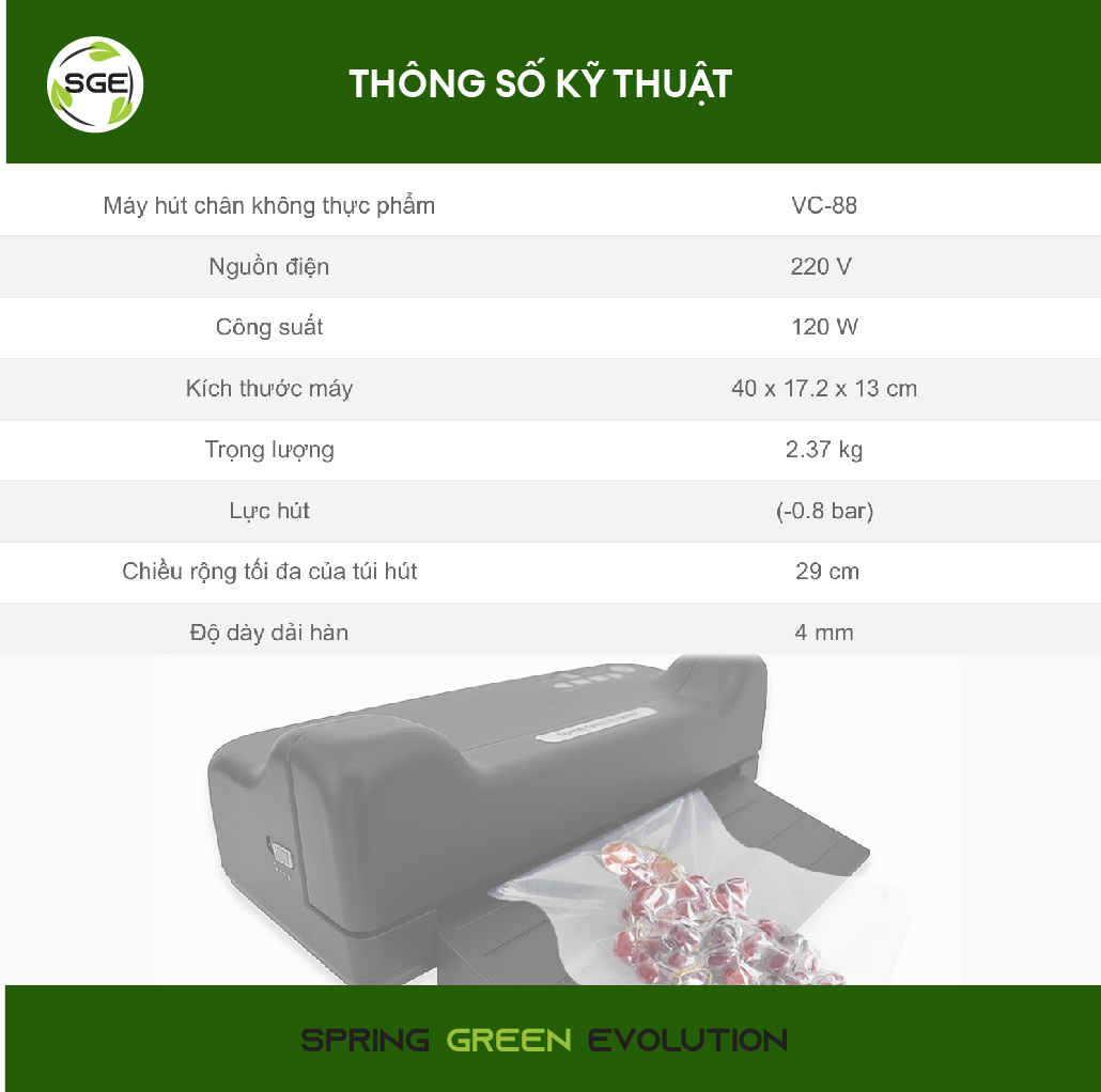 Máy hút chân không VC88 bán công nghiệp, loại máy chủ lực, chính hãng mà SGE là đơn vị duy nhất thiết kế và phát triển. Máy hút chân không bán tự động có thể hàn được nhiều loại túi trong khi vẫn giữ được vóc dáng nhỏ gọn. Máy có thể được sử dụng thoải mái trong gia đình đồng thời cũng có thể hàn được khối lượng túi lớn. Vì vậy máy rất được các doanh nghiệp SME ưa chuộng.