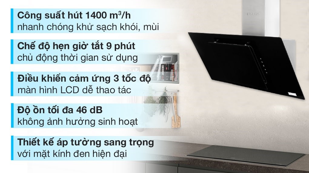 ĐẶC TÍNH SẢN PHẨM Hút mùi vát kính Chất liệu kính, inox cao cấp Mặt kính cường lực sang trọng Điều khiển cảm ứng 3 tốc độ Màn hình LCD tính