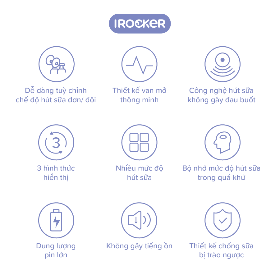 MÁY HÚT SỮA ĐIỆN ĐÔI IROCKER THÔNG MINH - BP001 Máy hút sữa điện đôi IROCKER sở hữu công nghệ hiện đại, chất lượng đạt chuẩn thương hiệu từ Úc đảm bảo giúp mẹ