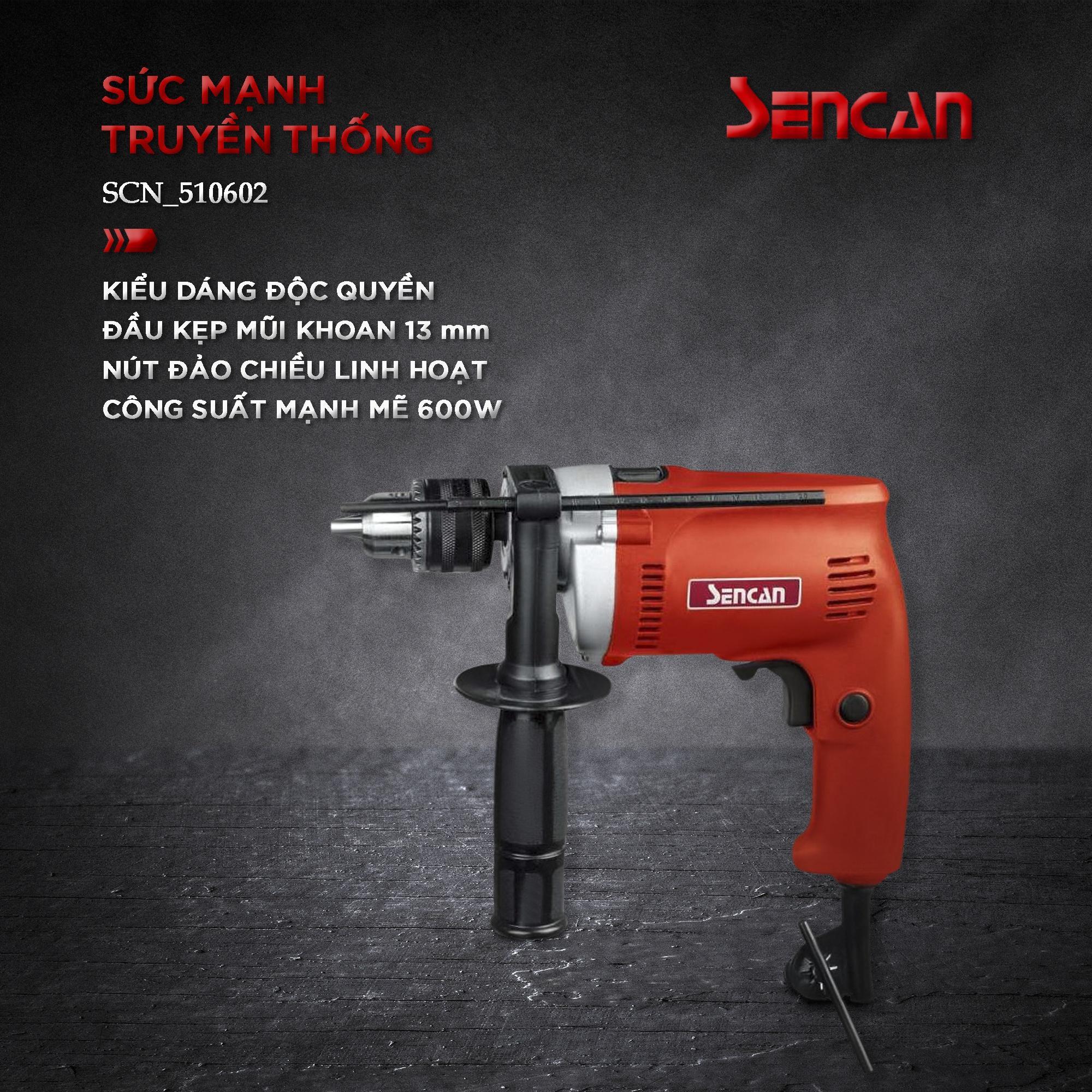 Với kiểu dáng nhỏ gọn, nhưng động cơ bên trong máy được Sencan đầu tư khá kỹ lưỡng. Bộ phận Roto và Stato máy được cấu tạo từ khối dây đồng cao cấp, bọc bên ngoài lớp thép dày dặn, giúp máy vận hành bền bỉ. Sencan 521302 công suất 600W, tốc độ không tải đạt 2.800 vòng/phút, tốc độ đập 45.000 lần/phút. Với 2 chức năng khoan chính: khoan thường và khoan búa. Kích thước mũi khoan bê tông (13mm), thép (10mm), gỗ (18mm) giúp đa năng trong mọi công việc, tiết kiệm 20% thời gian làm việc.