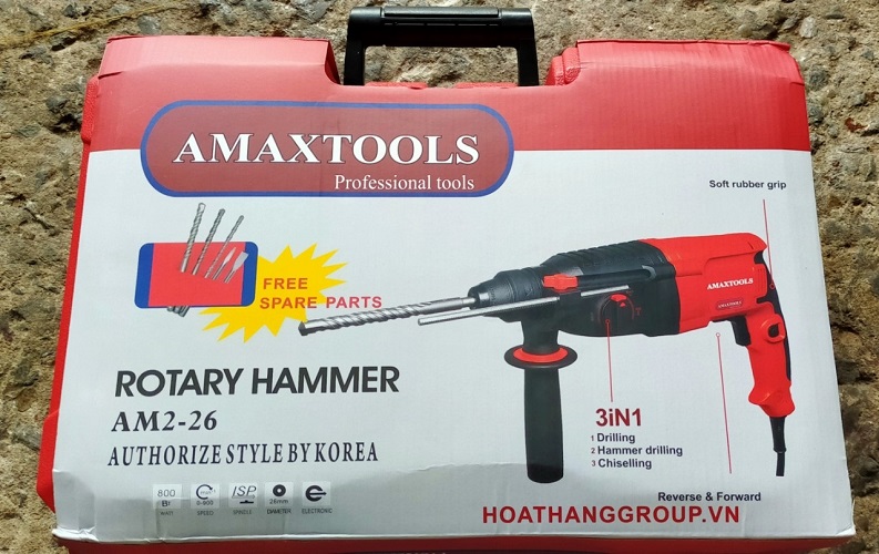 Máy khoan bê tông, khoan búa có khả năng phá dỡ những khối bê tông, nền gạch, đá một cách nhanh chóng. Máy khoan bê tông Amax AM 2-26 sử dụng mũi khoan có đường kính 26mm giúp khoan đục mạnh mẽ, nhanh chóng.