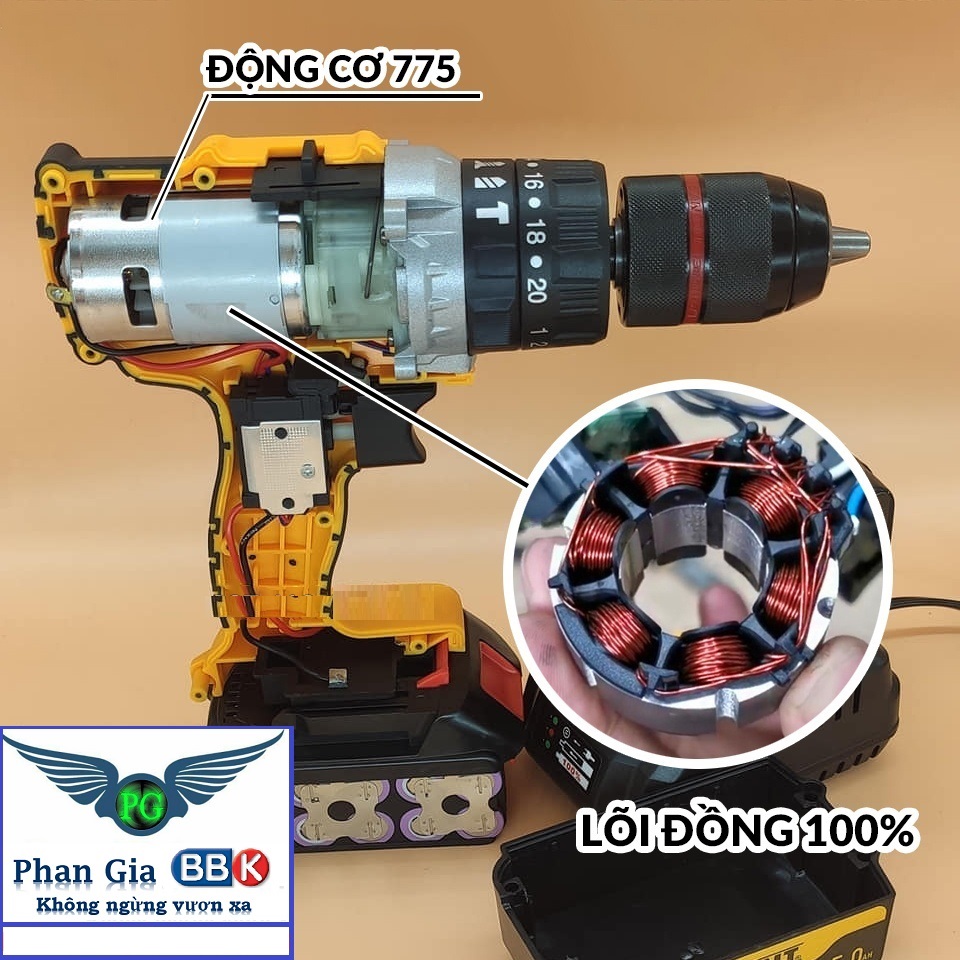 QUÝ KHÁCH LƯU ÝTHÔNG SỐ KỸ THUẬT CỦA MÁY:+ ĐỘNG CƠ MÁY có THAN: 775 - 10 CELL PIN LION 5.0AH+ Đầu khoan: 13mm + Có búa, khoan tường+ Chất liệu vỏ máy: Nhựa cao cấp+ Điện thế pin: 188V+ Loại Pin...