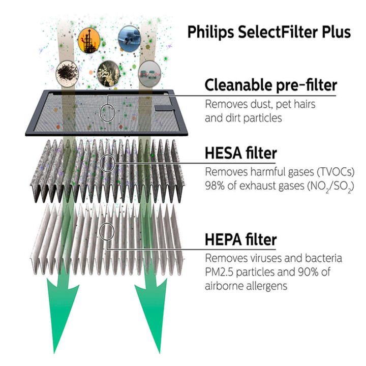 - Sử dụng công nghệ Airmax đời mới nhất của Philips, lọc 3 giai đoạn mạnh mẽ: Bộ lọc không khí GoPure của Philips có hệ thống lọc không khí nhanh và hiệu quả. SelectFilter Plus loại bỏ loại bỏ tới 125 chất gây ô nhiễm có hại và khí thải, thông qua các lớp HEPA và HESA. Được chứng nhận độc lập bởi Airmid Healthgroup, công nghệ SelectFilter Plus cũng loại bỏ tới 90% các chất gây dị ứng phấn hoa trong không khí.
