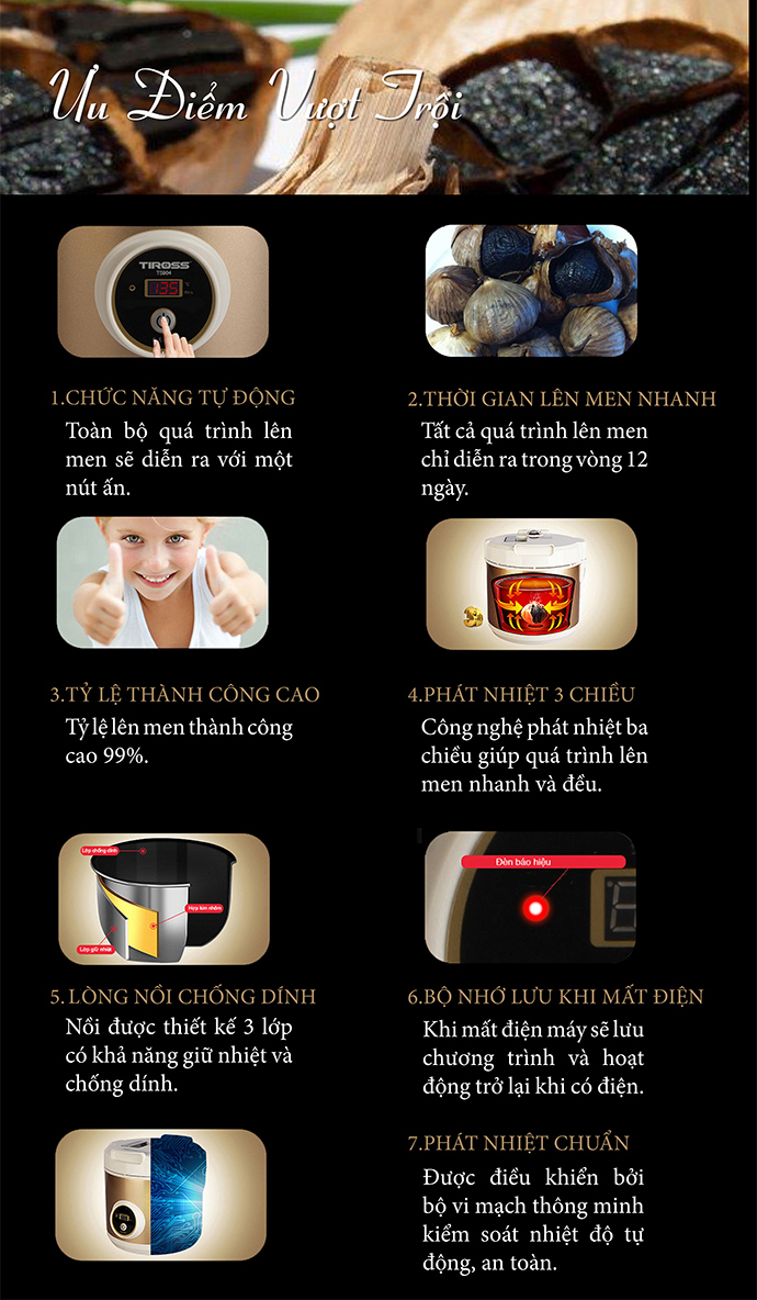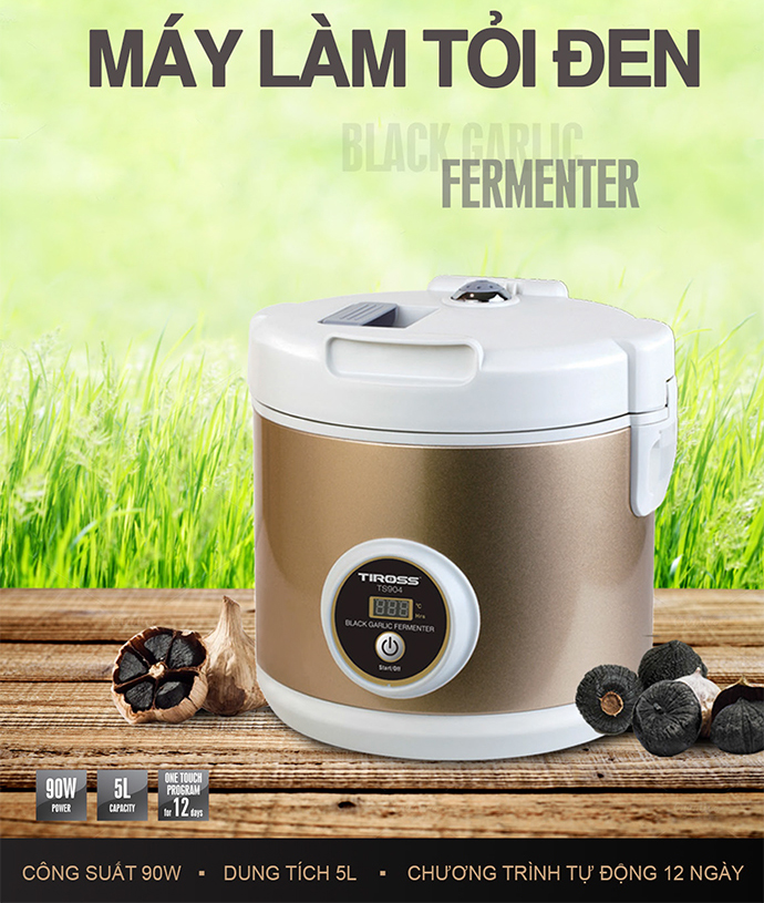 Thời gian lên men nhanh Máy làm tỏi đen Tiross TS904 90W 5L là một sáng tạo tiên tiến giúp bạn có được sức khỏe cân bằng cũng như có thể chống lại được một số nguy cơ bệnh tật. Máy có thiết kế đơn giản nhưng có cơ chế lên men tự động trong vòng 12 ngày với công suất 90W và tỷ lệ thành công lên đến 99% giúp bạn có được thực phẩm bổ ích cho sức khỏe gia đình lại tiết kiệm điện và thời gian. Thiết kế đơn giản, hiệu quả Máy làm tỏi đen Tiross TS904 90W 5L được thiết kế với những ưu điểm vượt trội bởi với cơ chế toàn bộ quá trình lên men sẽ diễn ra với một nút ấn đơn giản, giúp bạn thuận tiện và dễ dàng hơn khi làm tỏi đen.  Công nghệ phát nhiệt ba chiều Công nghệ phát nhiệt ba chiều giúp quá trình lên men nhanh và đều hơn. Lòng nồi được thiết kế 3 lớp chống dính an toàn. Đặc biệt, khi mất điện máy sẽ tự động lưu chương trình và hoạt động trở lại sau khi có điện. Phát nhiệt được điều khiển bởi bộ vi mạch thông minh, có thể kiểm soát nhiệt độ tự động và an toàn. Sử dụng dễ dàng Chỉ cần nhấn nút toàn bộ quá trình lên men sẽ diễn ra tự động, máy sẽ làm việc cho đến khi tỏi đen đều màu, quy trình hoạt động trong vòng 12 ngày liên tục, hiệu suất tăng cao cho ra những thành phẩm như bạn mong đợi. Tiross TS904 còn được tích hợp bộ nhớ lưu trữ chương trình nấu (nhiệt độ, khoảng thời gian) khi bị mất điện và hoạt động trở lại khi có điện  Công dụng của tỏi đen