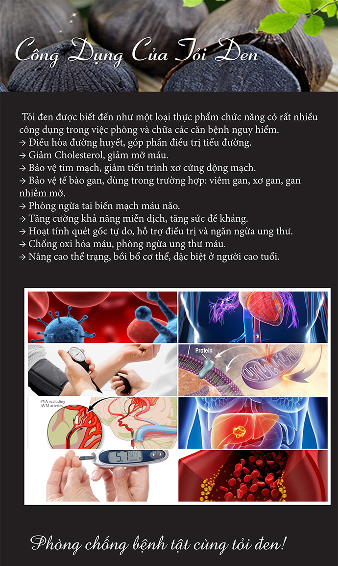 • Tỏi đen được biết đến như một loại thực phẩm chức năng có rất nhiều công dụng trong việc phòng và chữa các căn bệnh nguy hiểm.
