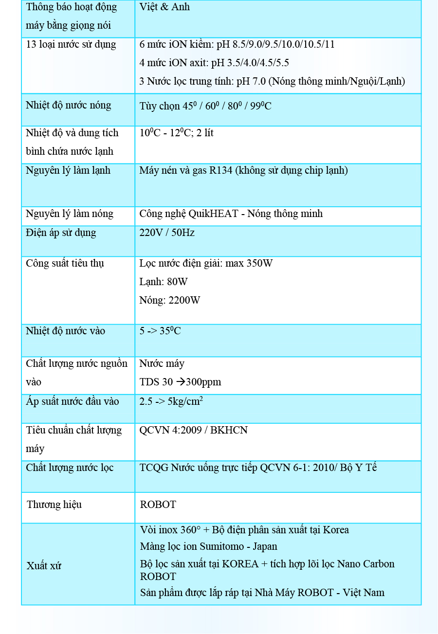 - Và 4 mức nước iON axit (pH 3.5/4.0/4.5/5.5). Chất lượng nước đạt chỉ số tối ưu, nồng độ Hydro hoạt tính lên đến ~ 1500 -> 1800 ppb, chống oxy hóa (ORP) lên đến ~ -850 -> -1000 mV, đáp ứng mọi nhu cầu sử dụng trong cuộc sống. Máy lọc nước điện giải iON kiềm Nóng Lạnh ROBOT ionQueen là dòng Để Bàn đầu tiên trên thế giới, được thiết kế kiểu dáng hiện đại, thiết kế chinh phục mọi không gian. Đặc biệt, được tích hợp thêm chức năng Nóng Thông Minh – Lạnh độc đáo & duy nhất trên thị trường, mang lại nhiều tiện ích cho người dùng. Chỉ số Hydrogen, ORP của nước tùy thuộc số tấm điện cực, đặc tính nguồn nước & “điều kiện đo trong phòng thí nghiệm chuyên nghiệp, đạt chuẩn”. Máy lọc nước điện giải iON kiềm Nóng Lạnh ROBOT ionQueen 1113, tạo 13 loại nước bổ ích, pH 3.5 --> 11.0 - Đáp ứng mọi nhu cầu trong cuộc sống Có thể tham khảo ý kiến của Bác sĩ hoặc chuyên gia dinh dưỡng để được hướng dẫn loại nước uống phù hợp nhất cho cơ thể. Kiểu dáng hiện đại - Thiết kế chinh phục mọi không gian ● Kiểu dáng để bàn, khác biệt so với các dòng điện giải khác ● Sử dụng linh hoạt cho mọi không gian ● Vòi nước điện giải xoay 360° ● Hệ thống điều khiển cảm ứng trên mặt phủ kính với màn hình LCD tinh tế Với mong muốn nhiều gia đình Việt có thể sử dụng nước điện giải iON kiềm với chi phí hợp lý để bảo vệ sức khỏe, sắc đẹp & nâng cao chất lượng cuộc sống, ROBOT mang đến sản phẩm “Chất lượng Quốc tế - Giá thành Việt Nam”, phù hợp với mức sống của nhiều người. Tiết kiệm cho người tiêu dùng đến hơn một nửa chí phí so với máy nhập khẩu chỉ từ 30 – 50%, nhưng sở hữu nhiều ưu điểm, tính năng vượt trội, chất lượng cao. Chế độ bảo hành chính hãng, tận nơi, vật tư và linh kiện, lõi lọc luôn có sẵn hạn chế tối đa chi phí sửa chữa, bảo trì. VĐV Cầu Lông Nguyễn Tiến Minh – tay vợt từng đứng Top 5 Thế Giới chia sẻ: Sau một thời gian sử dụng Máy lọc nước điện giải iON kiềm Minh thấy cải thiện sức khỏe rất nhiều và tốc độ hồi phục sau tập luyện, thi đấu cũng nhanh hơn so với trước đây. Bây giờ mỗi khi đi tập, hay khi đi thi đấu, Minh đều mang theo nước iON kiềm để uống. ROBOT là một thương hiệu Việt Nam uy tín nên Minh hoàn toàn tin tưởng và lựa chọn Máy lọc nước điện giải iON kiềm ROBOT. ️Thông Tin Thương Hiệu CÔNG TY CỔ PHẦN ĐẦU TƯ ROBOT