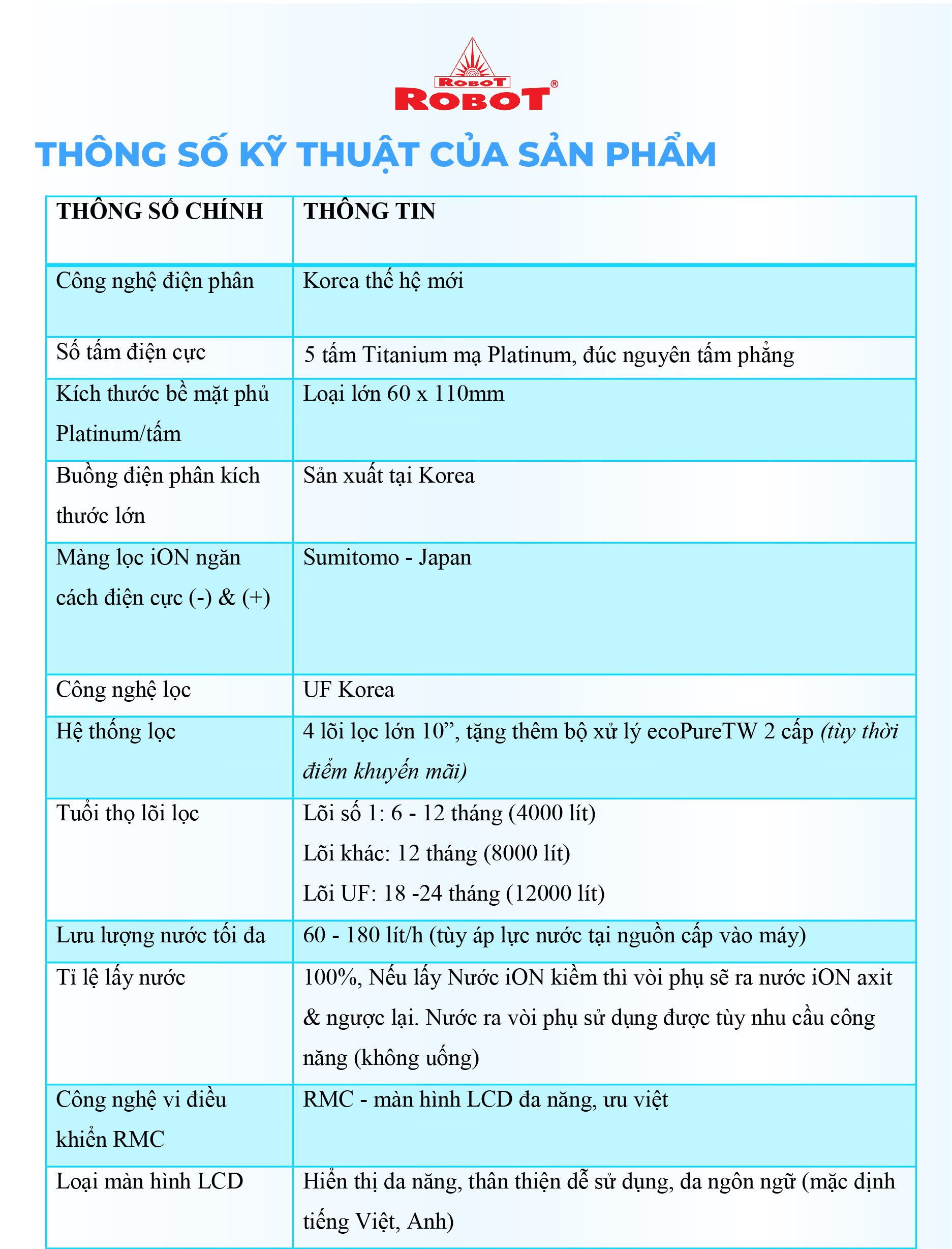 - Máy lọc nước điện giải iON kiềm ROBOT ionQueen 511 là sản phẩm được sản xuất với công nghệ tiên tiến, trang bị đến 5 tấm điện cực lớn nhất, có khả năng tạo ra đến 11 loại nước đa chức năng, với 5 mức nước iON kiềm (pH 8.5 – 10.5), nước lọc trung tính (pH 7.0) Nguội – Nóng – Lạnh & 3 mức nước iON axit (pH 4.5 - 5.5). Chất lượng nước đạt chỉ số tối ưu, nồng độ Hydro hoạt tính lên đến ~ 750 -> 850 ppb, chống oxy hóa (ORP) lên đến ~ -350 -> -500 mV, đáp ứng mọi nhu cầu sử dụng trong cuộc sống.