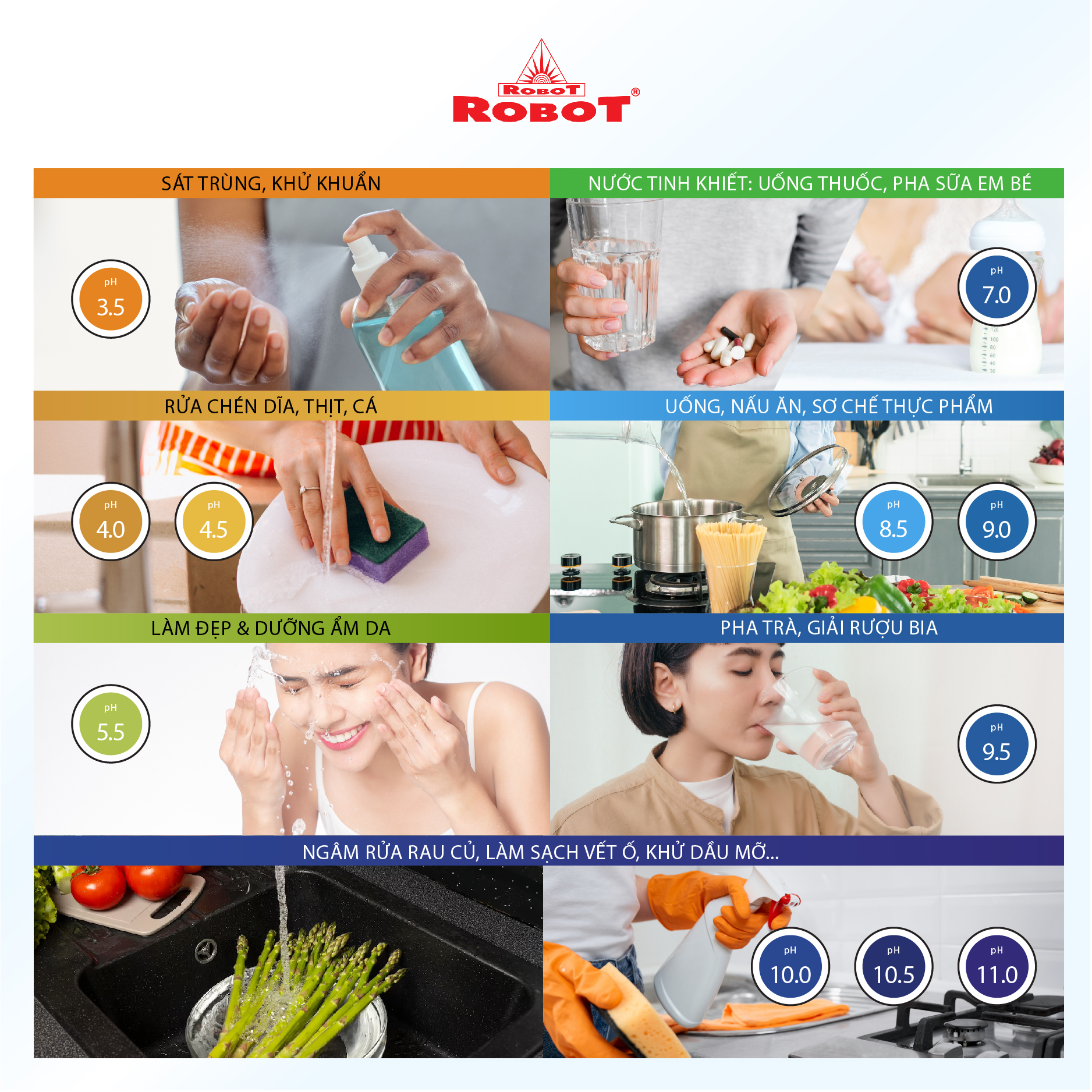 - Và 5 mức nước iON axit (pH 3.5/4.0/4.5/5.5). Chất lượng nước đạt chỉ số tối ưu, nồng độ Hydro hoạt tính lên đến ~ 1500 -> 1800 ppb, chống oxy hóa (ORP) lên đến ~ -850 -> -1000 mV, đáp ứng mọi nhu cầu sử dụng trong cuộc sống. Máy lọc nước điện giải iON kiềm Nóng ROBOT ionSmart được thiết kế kiểu dáng hiện đại, thiết kế chinh phục mọi không gian. Đặc biệt, bộ sưu tập 5 sắc màu pastel hiện đại đáp ứng mọi sở thích và phong cách nội thất, chắc chắn sản phẩm sẽ là điểm nhấn đặc sắc trong ngôi nhà của bạn. Chỉ số Hydrogen, ORP của nước tùy thuộc số tấm điện cực, đặc tính nguồn nước & “điều kiện đo trong phòng thí nghiệm chuyên nghiệp, đạt chuẩn”. ️ Máy lọc nước điện giải iON kiềm Nóng ROBOT ionSmart 1112, tạo 12 loại nước bổ ích, pH 3.5 --> 11.0 - Đáp ứng mọi nhu cầu trong cuộc sống Có thể tham khảo ý kiến của Bác sĩ hoặc chuyên gia dinh dưỡng để được hướng dẫn loại nước uống phù hợp nhất cho cơ thể. Kiểu dáng hiện đại - Thiết kế chinh phục mọi không gian