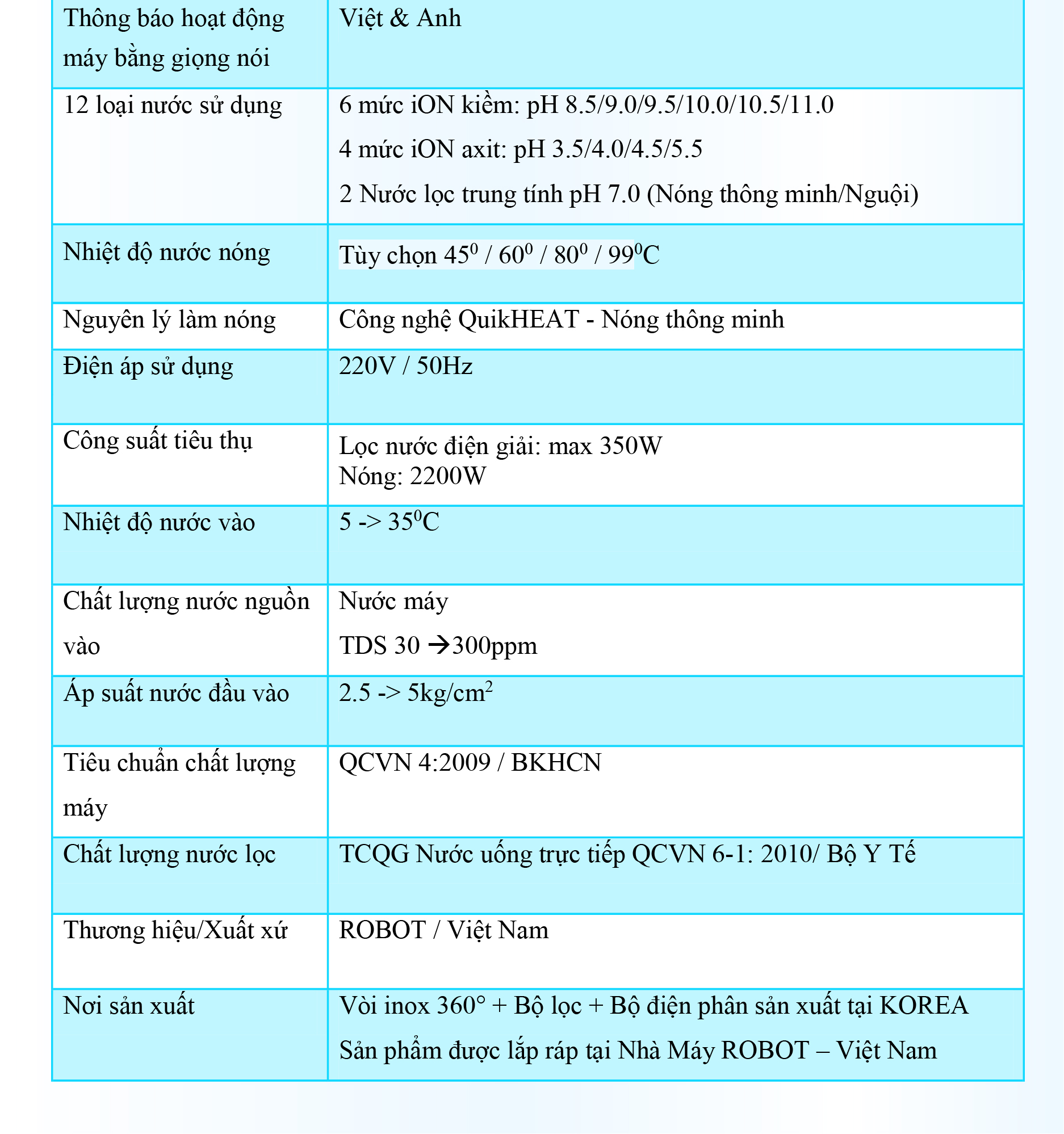- ️ Máy lọc nước điện giải iON kiềm ROBOT ionSmart 1112 là sản phẩm được sản xuất với công nghệ tiên tiến, cao cấp trang bị đến 11 tấm điện cực lớn nhất, có khả năng tạo ra đến 12 loại nước đa chức năng, với 6 mức nước iON kiềm (pH 8.5 - 11.0), nước lọc trung tính (pH 7.0) Nguội – Nóng & 5 mức nước iON axit (pH 3.5 - 5.5). Chất lượng nước đạt chỉ số tối ưu, nồng độ Hydro hoạt tính lên đến ~1500 -> 1800 ppb, chống oxy hóa (ORP) lên đến ~ -850 -> -1000 mV, đáp ứng mọi nhu cầu sử dụng trong cuộc sống.
