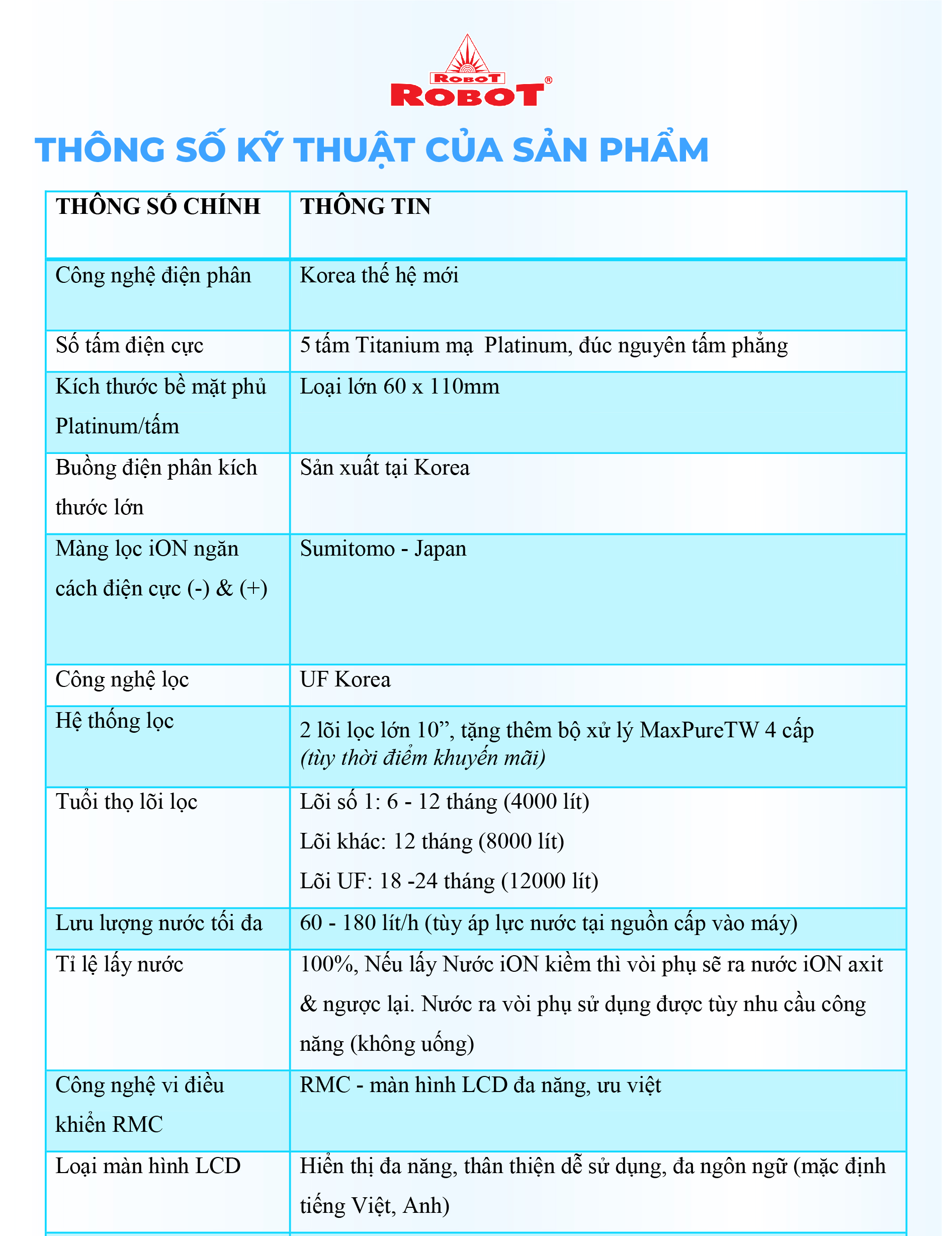 Mua tại TiktokMáy Lọc Nước Điện Giải Ion Kiềm ROBOT IonSmart 510 Nóng Thông Minh - Tạo 10 Loại Nước Máy lọc nước điện giải iON kiềm ROBOT ionSmart 510 là sản phẩm được sản xuất với công nghệ tiên tiến, cao cấp trang bị đến 5 tấm điện cực lớn nhất, có khả năng tạo ra đến 10 loại nước đa chức năng:
