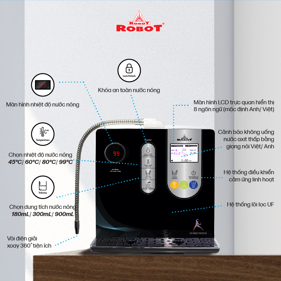 - Và 3 mức nước iON axit (pH 4.5/5.0/5.5). Chất lượng nước đạt chỉ số tối ưu, nồng độ Hydro hoạt tính lên đến ~ 800 -> 950 ppb, chống oxy hóa (ORP) lên đến ~ -400 -> -600 mV, đáp ứng mọi nhu cầu sử dụng trong cuộc sống. Máy lọc nước điện giải iON kiềm Nóng ROBOT ionSmart được thiết kế kiểu dáng hiện đại, thiết kế chinh phục mọi không gian. Đặc biệt, bộ sưu tập 5 sắc màu pastel hiện đại đáp ứng mọi sở thích và phong cách nội thất, chắc chắn sản phẩm sẽ là điểm nhấn đặc sắc trong ngôi nhà của bạn. Chỉ số Hydrogen, ORP của nước tùy thuộc số tấm điện cực, đặc tính nguồn nước & “điều kiện đo trong phòng thí nghiệm chuyên nghiệp, đạt chuẩn”. ️ Máy lọc nước điện giải iON kiềm Nóng ROBOT ionSmart 710, tạo 10 loại nước bổ ích, pH 4.5 --> 10.5 - Đáp ứng mọi nhu cầu trong cuộc sống Có thể tham khảo ý kiến của Bác sĩ hoặc chuyên gia dinh dưỡng để được hướng dẫn loại nước uống phù hợp nhất cho cơ thể. Kiểu dáng hiện đại - Thiết kế chinh phục mọi không gian