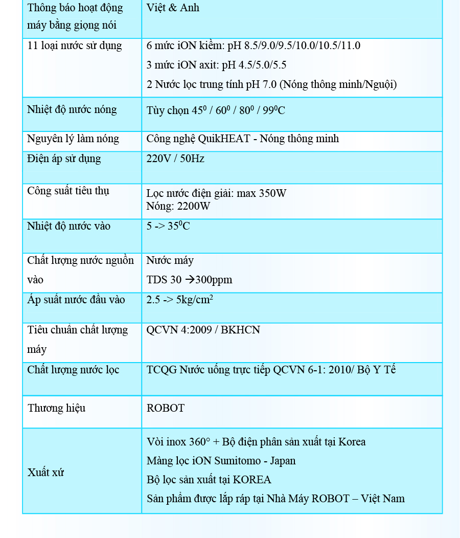 Với mong muốn nhiều gia đình Việt có thể sử dụng nước điện giải iON kiềm với chi phí hợp lý để bảo vệ sức khỏe, sắc đẹp & nâng cao chất lượng cuộc sống, ROBOT mang đến sản phẩm “Chất lượng Quốc tế - Giá thành Việt Nam”, phù hợp với mức sống của nhiều người. Tiết kiệm cho người tiêu dùng đến hơn một nửa chí phí so với máy nhập khẩu chỉ từ 30 – 50%, nhưng sở hữu nhiều ưu điểm, tính năng vượt trội, chất lượng cao.