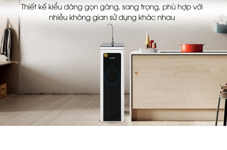 Kiểu dáng tủ đứng thon gọn tô điểm cho không gian hiện đại hơn Máy lọc nước RO Hydrogen nóng nguội 10 lõi Karofi KAH-D10 có kiểu dáng tủ đứng thon gọn, tiết kiệm diện tích