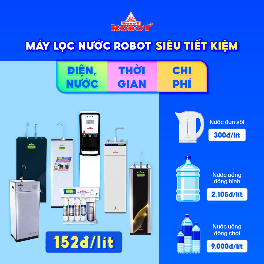 • Giá thành phù hợp, tiết kiệm chi phí sử dụng nước mỗi ngày Sử dụng Máy lọc nước ROBOT giúp TIẾT KIỆM rất lớn chi phí sử dụng bình nước 20 lít, cũng như không tốn điện & thời gian khi phải đun sôi nước để uống. Hiệu quả kinh tế tối đa, thời gian thu hồi vốn chỉ từ 6 tháng đến 1 năm. Chi Phí Nước Uống (lít)