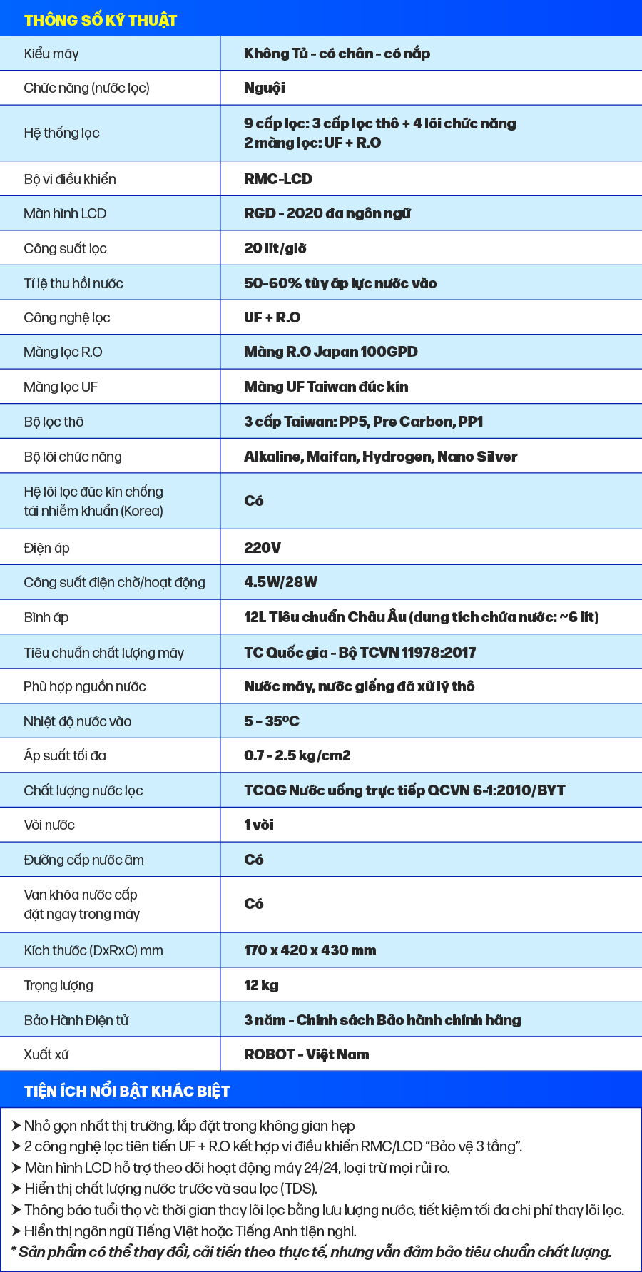 - Máy lọc nước ROBOT ALPHA PRO 9GK-UR thuộc dòng Máy lọc nước thế hệ mới của ROBOT, duy nhất trên thị trường sử dụng công nghệ “Bảo vệ 3 tầng” gồm 2 màng lọc UF + R.O & vi điều khiển RMC/LCD, hỗ trợ người dùng trực tiếp kiểm soát chất lượng nước trước & sau lọc, cảnh báo rủi ro trong quá trình sử dụng.