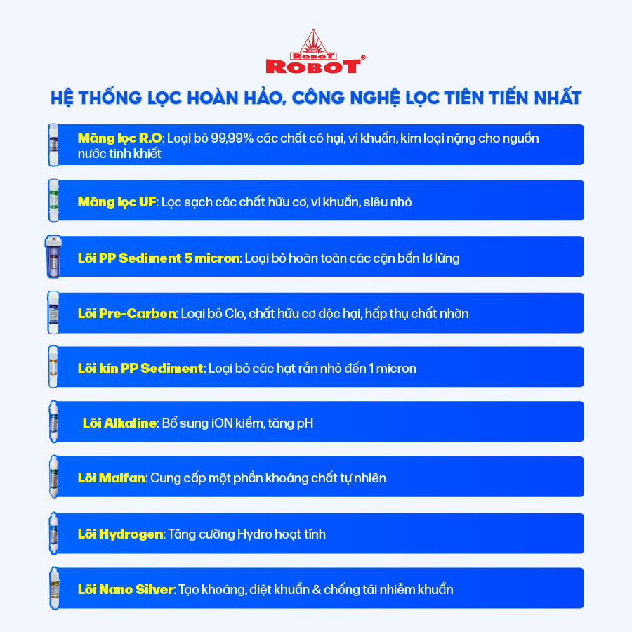 - Máy được tích hợp 2 công nghệ lọc tối ưu nhất hiện nay là UF (Ultrafiltration) & R.O (Reverse Osmosis) cho nguồn nước sau lọc sạch tối đa, được loại bỏ hoàn toàn cặn bẩn hay chất gây hại. Hệ thống đa cấp lọc mạnh mẽ của ROBOT ALPHA PRO 9GK-UR