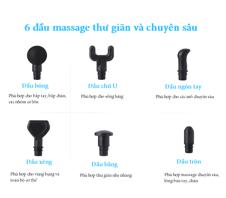 SÚNG MASSAGE CẦM TAY, MÁY MASSAGE CỔ VAI GÁY LOẠI TO, 6 LEVEL 4 ĐẦU MASSAGE Công dụng Và Chức Năng - Đầu massage bóng tiêu chuẩn: thích hợp để massage các lực