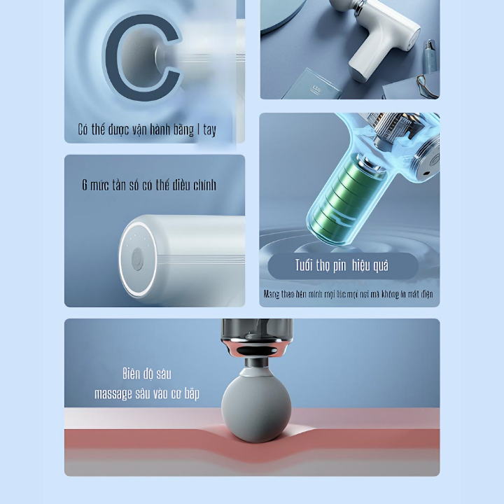 - Có 4 đầu massage: đầu hình cầu, đầu chữ U, đầu phẳng, đầu hình trụ - Tốc độ động cơ: 3200 PRM - Thời gian sạc 3h - Dung lượng pin: 2000 mAh -
