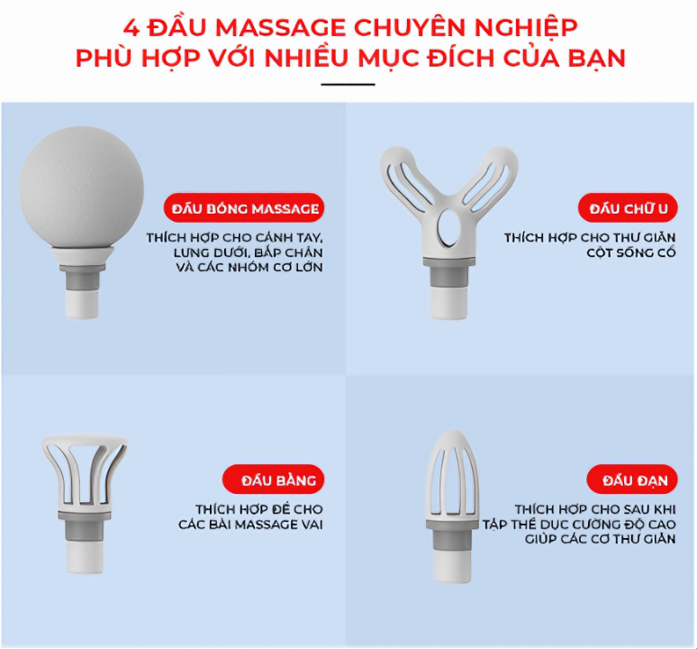 SÚNG MASSAGE CẦM TAY, MÁY MASSAGE CỔ VAI GÁY LOẠI TO, 6 LEVEL 4 ĐẦU MASSAGE Công dụng Và Chức Năng - Đầu massage bóng tiêu chuẩn: thích hợp để massage các lực