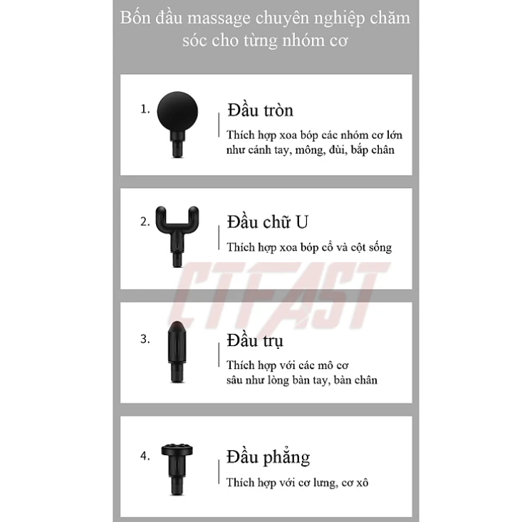 SÚNG MASSAGE CẦM TAY, MÁY MASSAGE CỔ VAI GÁY LOẠI TO, 6 LEVEL 4 ĐẦU MASSAGE Công dụng Và Chức Năng - Đầu massage bóng tiêu chuẩn: thích hợp để massage các lực