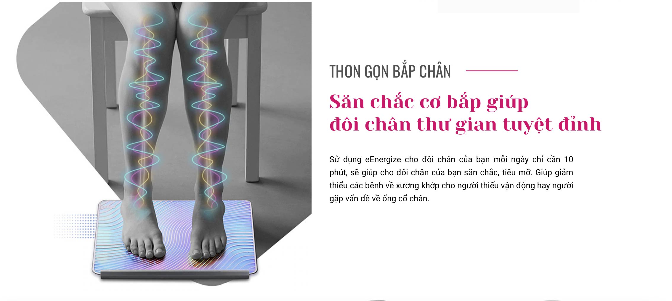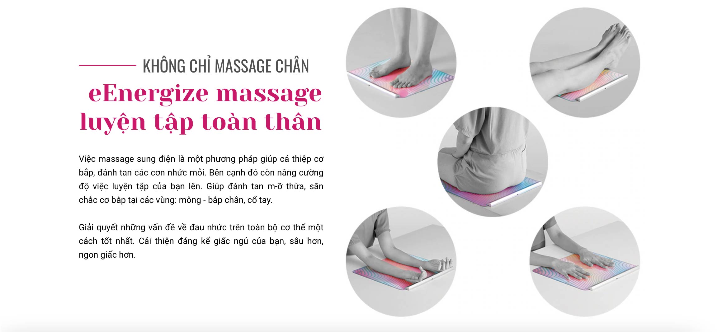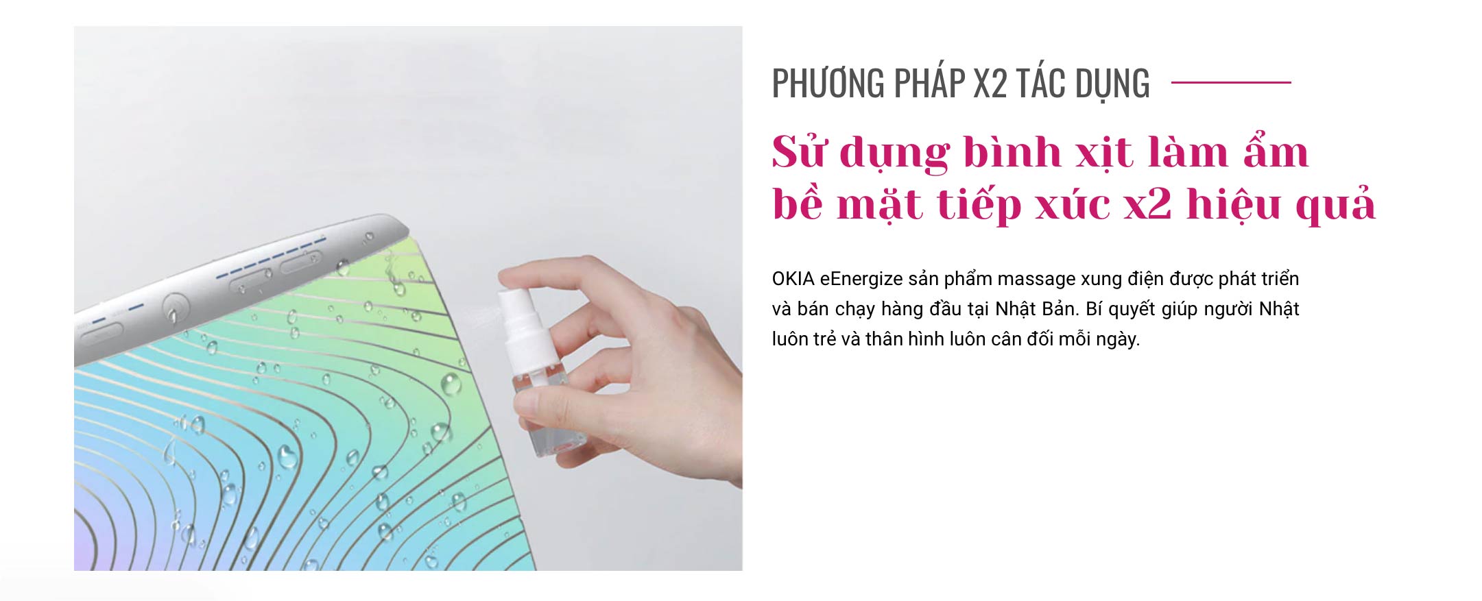Máy massage xung điện giúp làm giảm cảm giác đau đớn. Khi các dòng điện tần số thấp đi vào vùng bị đau, nó tác động vào cơ chế truyền đau và làm giảm khả năng truyền đau tới não. Ngoài ra, các tần số xung điện tác động vào cơ giúp cho cơ bắp được xoa bóp và làm giảm cơn đau. Massage xung điện giúp tăng cường tuần hoàn máu. Các xung điện từ vị trí đau đi vào cơ thể làm cơ tim co giãn nhịp nhàng. Điều này gián tiếp giúp lưu thông khí huyết hạn chế các triệu chứng phù nề, tê bì chân tay dó máu khó lưu thông tới các chi. Massage xung điện giúp giải tỏa căng thẳng và khiến giấc ngủ sâu hơn. Các xung điện với tần số thấp tác động sâu vào các mô. Xung điện qua da kích thích các dây thần kinh nằm bên dưới, giúp thư giãn mang lại những giấc ngủ sâu hơn. Massage xung điện tác động lên mô mỡ, giúp săn chắc cơ thể Nhiệt từ các xung điện tác động lên da làm tan các mô mỡ. Bằng cách massage xung điện, bạn có thể giảm mỡ thừa một cách đáng kể. Do đó, massage eo thường xuyên sẽ giúp bạn có một vòng eo thon gọn. Ngoài ra, OKIA eEnergize giúpmang lại đôi chân thon gọn nhờ massage bắp chân và toàn bộ cơ thể.