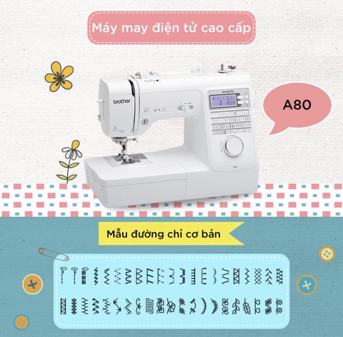 Hiện đại hơn, máy may còn trang bị nút khóa mũi khâu, điều khiển tốc độ loại trượt cho bạn nhanh chóng thao tác và an toàn khi sử dụng thiết bị cho việc may vá tại nhà. Brother A80 hoạt động hiệu quả, mạnh mẽ với động cơ chạy cực êm, tiết kiệm điện tối ưu và cho chất lượng mũi may cải thiện đáng kể.