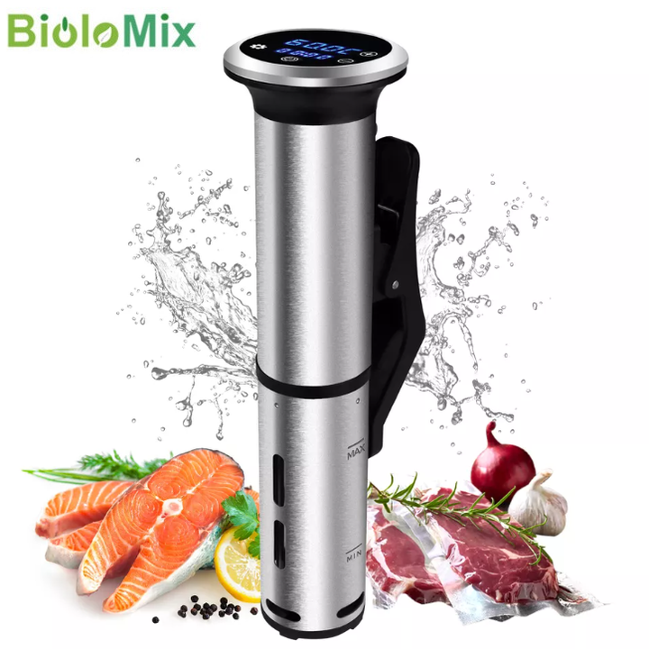 - Đảm bảo được màu sắc tự nhiên, vẻ thẩm mỹ của thực phẩm; gia tăng hiệu quả nấu ăn - Chất lượng ổn định, an toàn suốt quá trình nấu Giới thiệu máy nấu chậm Sous Vide BioloMix SV-8006 siêu MỚI Thế hệ thứ 2,5 công suất cao tối đa 1200 watt cho thời gian nấu và làm nóng trước chắc chắn nhanh hơn rất nhiều so với các loại Sous vide khác có trên thị trường chỉ sử dụng 800 watt hoặc 1000 watt Nấu ăn như một Cheef Pro – Bộ nấu ăn mới Biolomix Sous vide SV-8006 mới cho phép bạn nấu một bữa ăn chất lượng như nhà hàng tại nhà. Bếp Sous Vide của chúng tôi là thiết bị nhà bếp hoàn hảo để nấu các loại rau, thịt và hơn thế nữa với khả năng kiểm soát nhiệt độ nấu nhất quán và chính xác. Điều chỉnh nhiệt độ và hẹn giờ chính xác – Bảng điều khiển Hẹn giờ-Kỹ thuật số chính xác giúp nhiệt độ chính xác đến ± 0,1 ℃. Phạm vi nhiệt độ đa dạng (từ 0 ° C đến 90 ° C) và kiểm soát thời gian cho phép bạn nấu bất kỳ loại thực phẩm nào bạn thích. Chế độ nấu bằng Sous vide ngăn chặn tối đa mất nước cần thiết và giữa lại hương vị cho món ăn. Dễ đáng sử dụng và vệ sinh – Chỉ cần gắn nồi vào bất kỳ nồi nào, thêm nước, cho các nguyên liệu của bạn vào túi hút chân không. Bắt đầu nấu chỉ với một nút bấm trên thiết bị. Chế độ hẹn giờ và kiểm soát nhiệt độ của nồi Sous vide cho phép bạn thư giãn trong khi nấu ăn, các phần tiếp xúc nước bằng thép không gỉ có thể tháo rời của bếp sous vide an toàn và vệ sinh dễ dàng, thiết bị nhà bếp này dễ dàng vệ sinh và bảo trì. Làm nóng nhanh