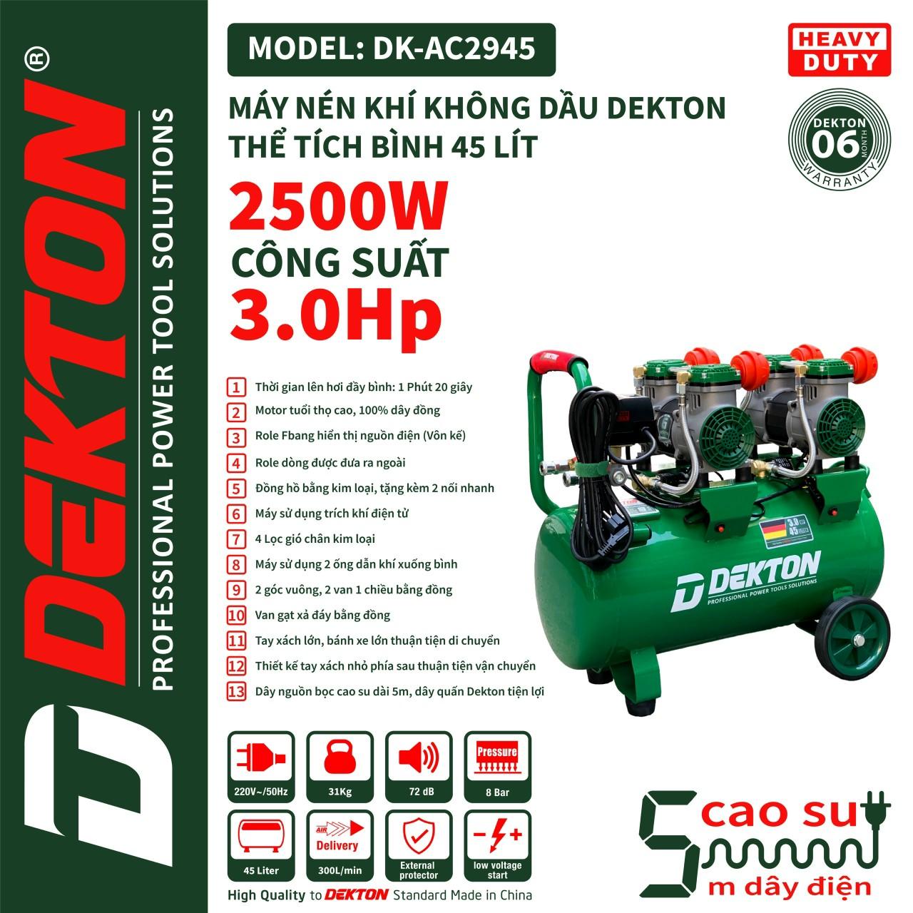 ✨MÁY NÉN KHÍ KHÔNG DẦU 45L 2500W DEKTON DK-AC2945 - HÀNG CHÍNH HÃNG