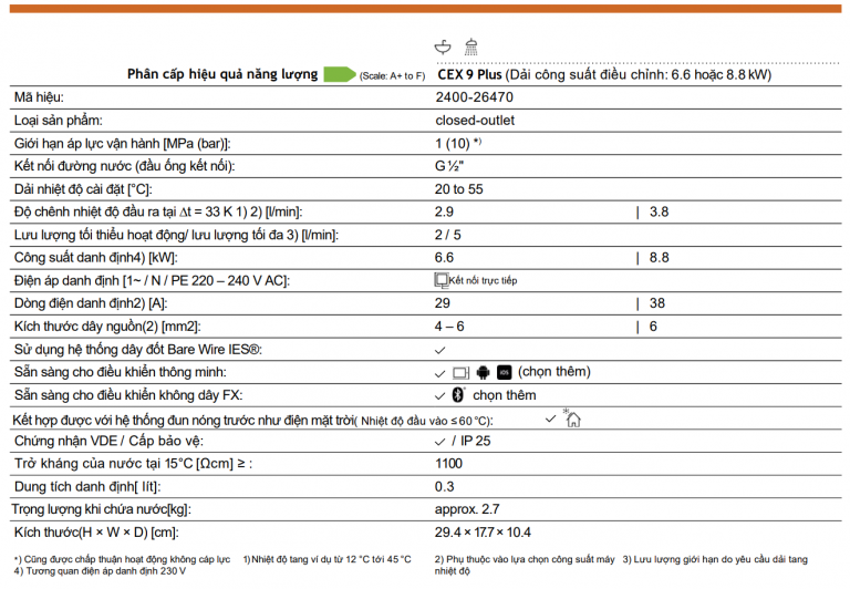 • Với Hệ thống tương thích nhiều nguồn MPS, định mức công suất tối đa sẽ được cài đặt tại thời điểm lắp đặt thiết bị: 6.6 or 8.8 Kw.   Dễ dàng lắp đặt Sản phẩm với kích thước nhỏ gọn có thể dễ dàng lắp đặt tại 1 trong 2 vị trí và đầu nối nước ren ngoài ½ inch.   Thông số kỹ thuật của thiết bị: