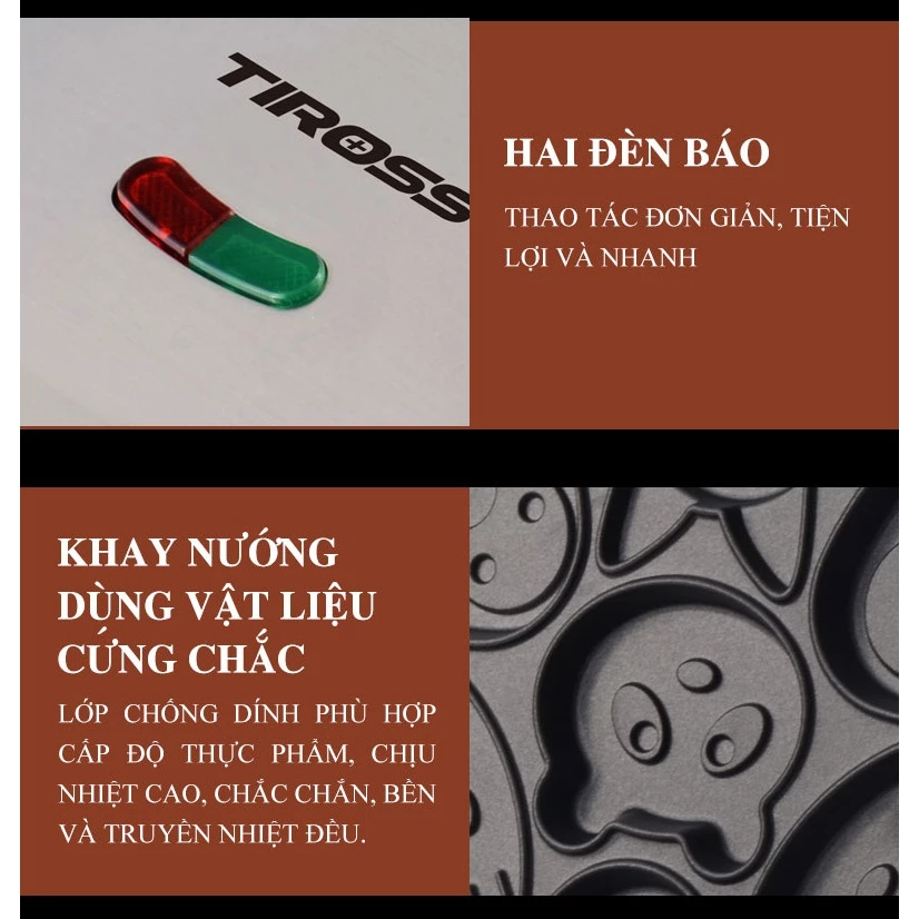 Máy nướng bánh snack Tiross TS9672 là một sản phẩm hữu ích, mang đến cho gia đình những chiếc bánh nướng thơm ngon phục vụ bữa sáng đủ chất. Sản phẩm có thiết kế gọn gàng, hiện đại, vỏ ngoài làm từ vật liệu cách nhiệt an toàn, dễ lau chùi. Tay cầm của kẹp cũng được làm từ nhựa cách nhiệt, giúp bạn cầm nắm an toàn. Ưu điểm máy nướng bánh Tiross TS9672 Phần khay nướng của TS9672 được phủ lớp chống dính cao cấp, giúp bánh tạo thành các loại hình thù đẹp mắt mà không bị sát gây vỡ hoặc cháy khét, đồng thời cũng giúp bạn vệ sinh dễ dàng. Lớp chống dính này rất an toàn cho sức khỏe, không thôi nhiễm các chất độc hại ở nhiệt độ cao. Máy làm bánh có thể làm đồng thời 7 bánh một lúc, khuôn bánh hình động vật đáng yêu. Khuôn sắc nét giúp thành phẩm bánh đẹp và không bị tràn nhân. Máy nướng bánh snack Tiross TS9672 còn được thiết kế hai đèn báo giúp bạn nhận biết lúc nào máy đã nướng xong. Với công suất mạnh mẽ lên tới 700W, sản phẩm giúp tỏa nhiệt đều và nhanh, tiết kiệm thời gian cho bạn. Tiross TS9672 được trang bị rơ le tự động tự ngắt khi quá tải vô cùng an toàn. Khay nướng được thiết kế cài trên dưới đảm bảo không gây thoát nhiệt, giúp tiết kiệm điện năng một cách tối ưu.