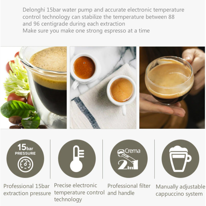 - Máy pha Delonghi có công suất hoạt động mạnh mẽ lên đến 1100W, máy được hoạt động bằng điện, không cần mất nhiều thời gian để chờ đợi cafe pha xong với thao tác đơn giản, người dùng chỉ cần bỏ bột cafe vào lưới lọc, đổ nước vào máy, đóng nắp lại, đặt bình vào đúng vị trí để cà phê chảy vào bình và nhấn nút khởi động, đèn báo sáng sẽ sáng lên báo hiệu máy đã hoạt động và chờ vài phút là sẽ có ngay những ly cafe thơm ngon để thưởng thức. Hệ thống điều chỉnh bọt sữa thông minh