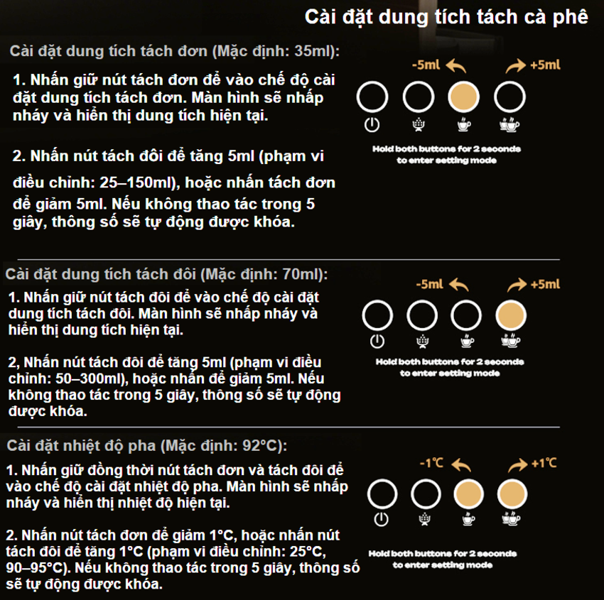 - Điều chỉnh dung tích pha, cốc đơn 25-150ml, cốc đôi 50-300ml