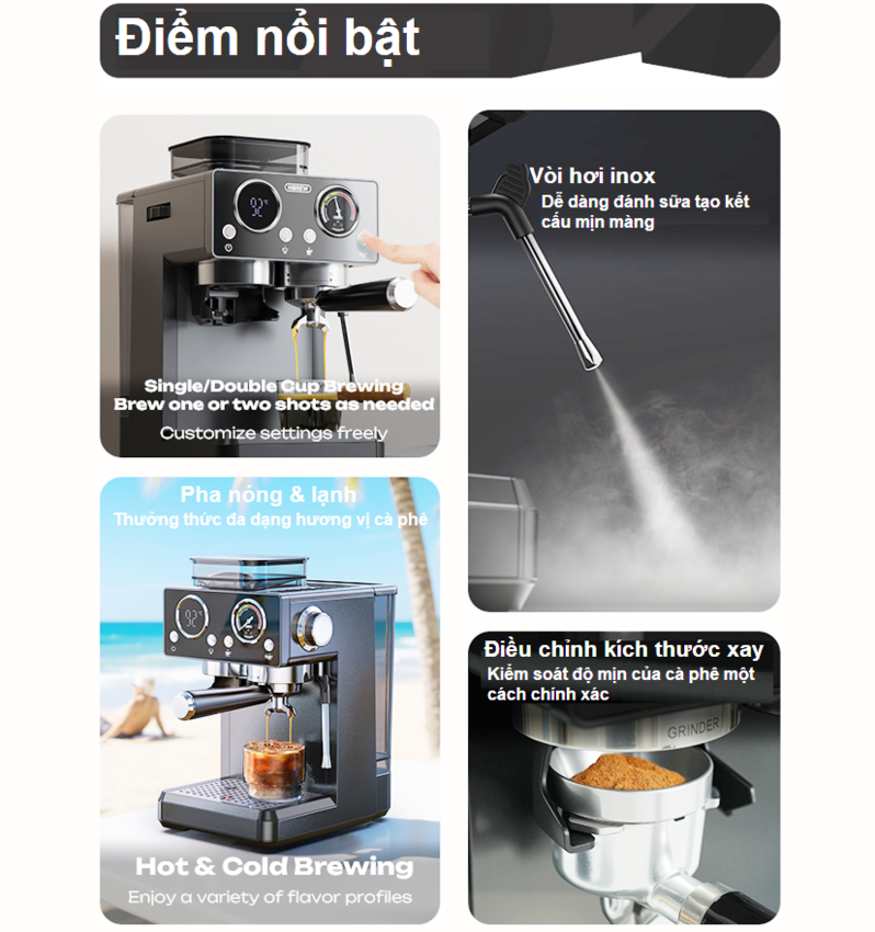 - Tiện ích xay và pha cà phê trên 1 sản phẩm (Pha 3 trong 1, xay 20 chế độ)