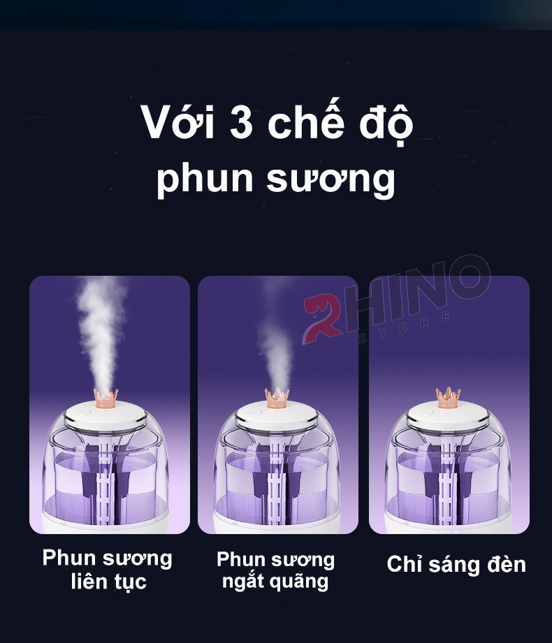 Mua tại TiktokMáy phun sương xông tinh dầu tạo ẩm Rhino H105 dung tích 1000ml không gây tiếng ồn, tích hợp đèn ngủ RGB nhiều màu Máy phun sương tạo ẩm là một thiết bị rất cần thiết đối với mọi gia đình trong thời tiết khô hanh, độ ẩm thấp với tác dụng chính là cấp thêm độ ẩm trong không khí. Từ đó giúp da không bị mất nước, khô nứt nẻ đặc biệt vùng môi và da mặt tạo ra môi trường sống thoải mái và dễ chịu nhất, không còn mặc cảm khi tiếp xúc với mọi người. Khi kết hợp với tinh dầu sẽ tạo ra bầu không khí dễ chịu, tránh nấm mốc và côn trùng ruồi muỗi (không nên lạm dụng và phải chọn đúng tinh dầu chất lượng tốt)
