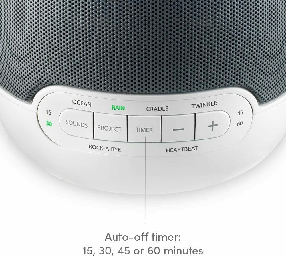 Ngoài âm lượng có thể điều chỉnh, bạn nên đặt hẹn giờ tắt tự động trong 15, 30, 45 hoặc 60 phút để không làm ảnh hưởng giấc ngủ của trẻ sau khi trẻ đã được xoa dịu.