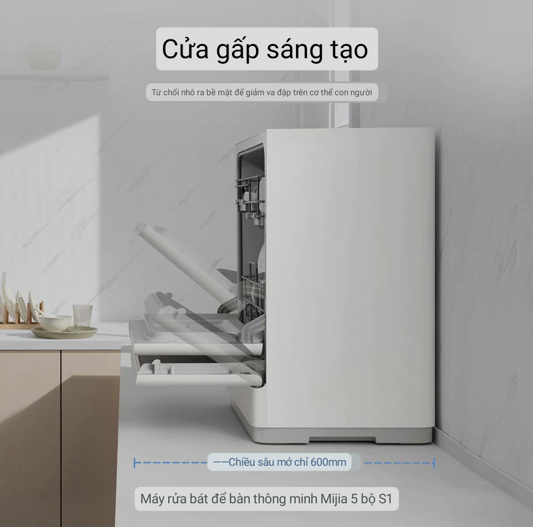 Máy rửa bát để bàn thông minh Mijia S1 có chiều sâu thân máy chỉ là 350mm và chiều rộng thân máy là 550mm, chiếm khoảng 0,19 mét vuông mặt bàn; nó có thể rửa 5 bộ đồ ăn tiêu chuẩn cùng một lúc, tổng c...
