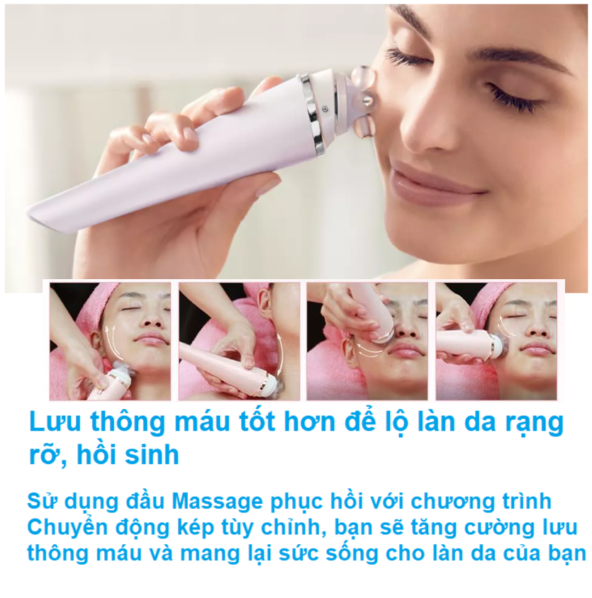 - Sử dụng đầu Massage phục hồi với chương trình Chuyển động kép tùy chỉnh, bạn sẽ tăng cường lưu thông máu và mang lại sức sống cho làn da của bạn. Điều này làm nổi bật vẻ rạng rỡ tự nhiên Cảm giác như 750 lần gõ ngón tay nhẹ nhàng mỗi phút