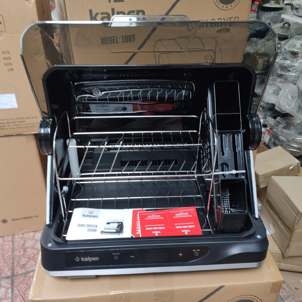 - Máy sấy bát là một thiết bị nhà bếp hữu ích được sử dụng ngày càng rộng rãi và phổ biến. Không chỉ có sức năng sấy khô bát đĩa mà còn có chức năng diệt trừ vi khuẩn nấm mốc. Máy sấy bát góp phần chăm sóc sức khỏe gia đình và giúp cho không gian bếp hiện đại thêm tiện nghi, sang trọng. Dung tích 58L với buồng sấy rộng rãi có thể đáp ứng được tốt cho nhu cầu sử dụng chén bát, đĩa…của một gia đình 6-8 thành viên. Khay máy sấy bát Kalpen DD99 có 2 tầng: tầng dưới có 2 hàng có thể để tối đa 18 bát nhỏ ăn cơm, tầng trên có thể để chén bát to hoặc đĩa. Ngoài ra có khay riêng để cài dao chặt, dao thái, dao cài hoa quả, 1 ống đựng đũa, 1 ống đựng thìa nĩa nhỏ, 1 ống đựng thìa lớn, muôi canh.