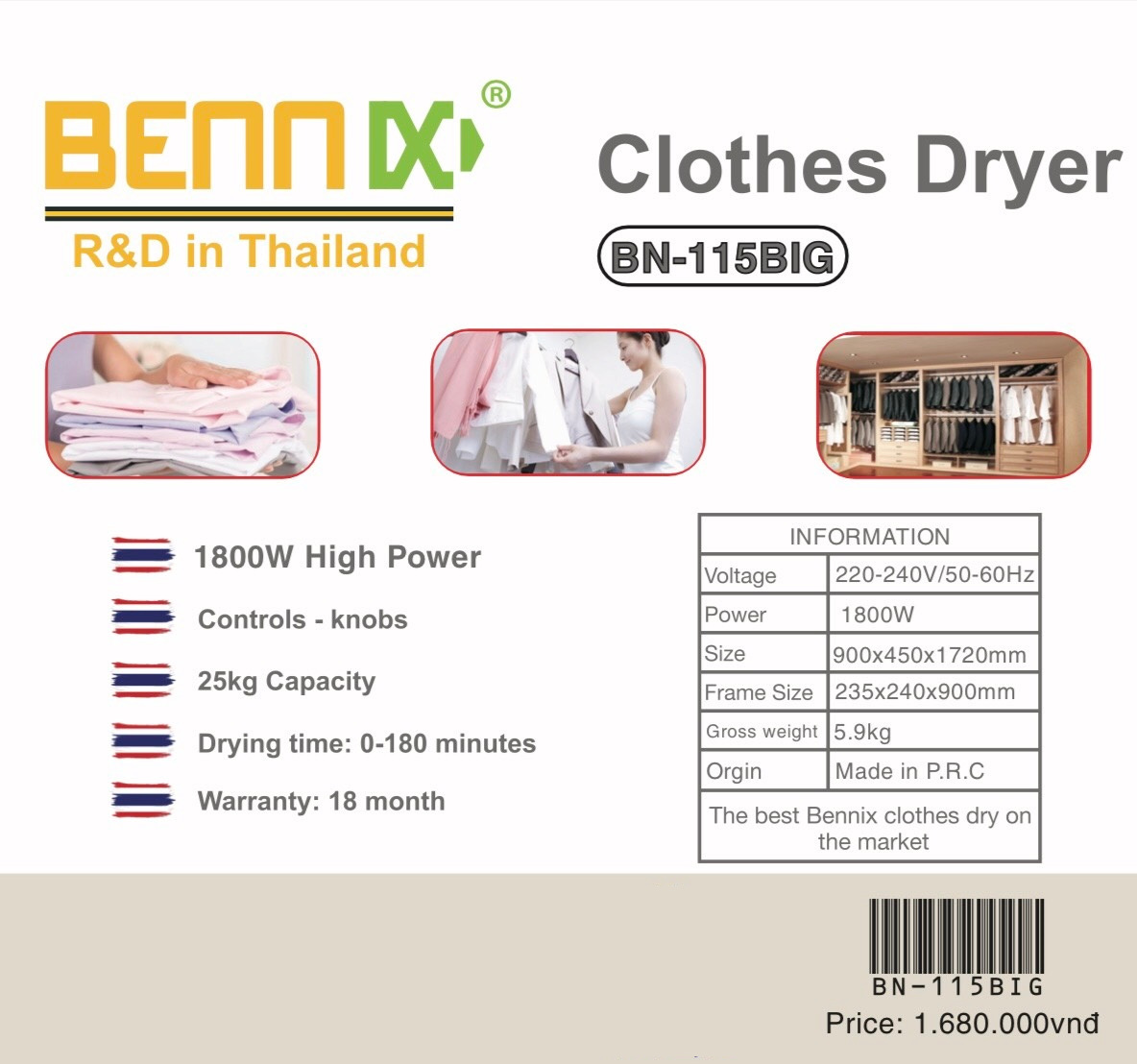 - Máy sấy quần áo Bennix BN-115BIG là loại cao cấp nhất trên thị trường hiện nay, với thiết kế to hơn, dày hơn, chắc chắn hơn, đẹp hơn và đẹp hơn rất nhiều so với các loại trên thị trường và đi cùng điều này thì giá sản phẩm cũng cao hơn một chút so với giá trên thị trường.