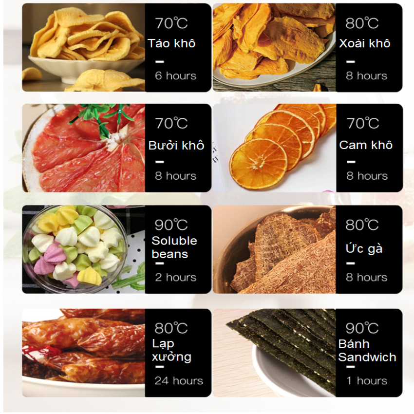 - Nâng cấp động cơ quạt mạnh hơn giúp sấy khô nhanh hơn Sấy đa dạng các loại hoa quả, thực phẩm