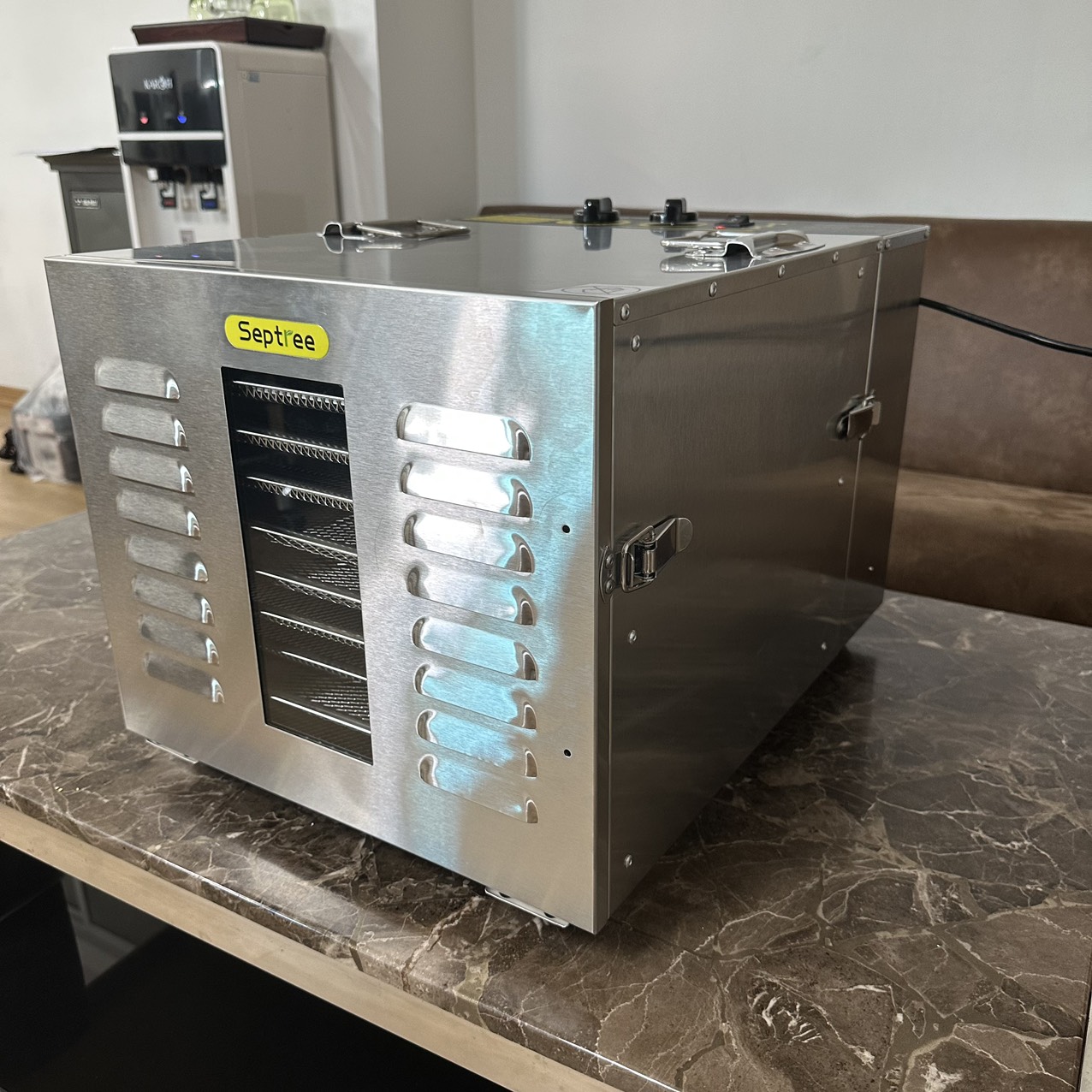 - Máy sấy thực phẩm 10 khay Septree, sử dụng hệ thống gia nhiệt ngang. Khay sấy nằm ngang, trong khi các thanh nhiệt lại được dựng đứng, dòng khí được gia nhiệt, thổi đi từ sau ra trước, tiếp cận trực tiếp từng khay thực phẩm.