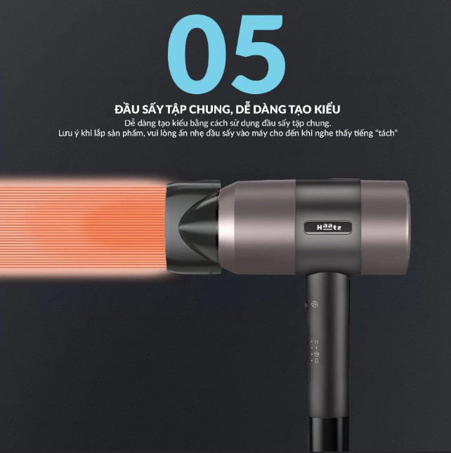 Động cơ không chổi than tốc độ cao 110.000 rpm, tốc độ gió 65m/s, làm khô tóc ngắn chỉ trong 40 giây Cảm biến kiểm soát nhiệt thông minh NTC, kiểm soát nhiệt độ 100